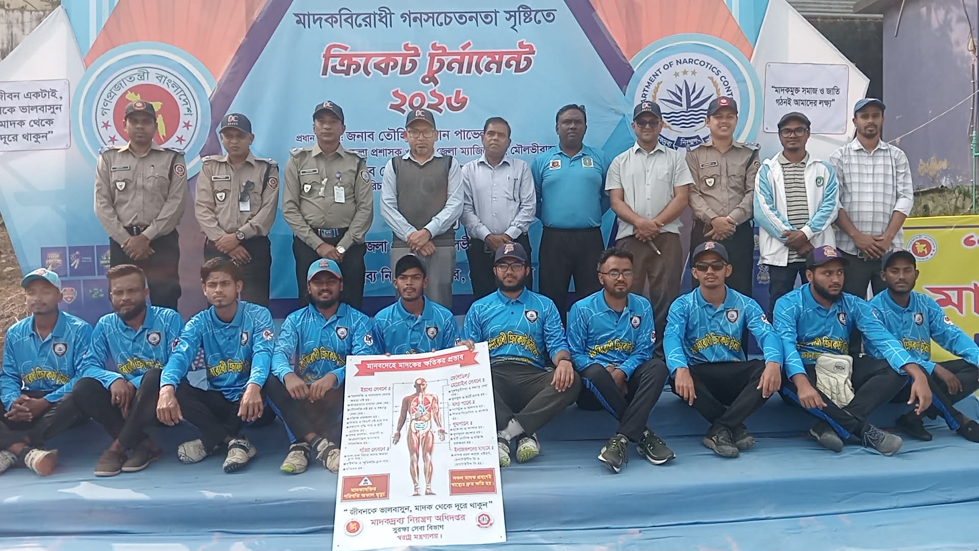 আব্দুল বাছিত খানঃ মৌলভীবাজার জেলা প্রশাসন ও জেলা মাদকদ্রব্য নিয়ন্ত্রণ অধিদপ্তর, মৌলভীবাজার এর আয়োজনে, মাদকবিরোধী গনসচেতনতা সৃষ্টিতে, মৌলভীবাজার কলেজ স্টেডিয়াম মাঠে ক্রিকেট টুর্নামেন্ট-২০২৬ইং অনুষ্টিত হয়েছে ২০ জানুয়ারী দুপুরে। জেলা মাদকদ্রব্য নিয়ন্ত্রণ অধিদপ্তর, মৌলভীবাজার এর উপপরিচালক মো: রাশেদুজ্জামান এর সভাপতিত্বে ও মৌলভীবাজার জেলা ক্রীড়া কর্মকর্তা মো: মাজহারুল মজিদ এর সঞ্চালনায় আয়োজিত ক্রিকেট টুর্নামেন্ট জেলা প্রশাসক এর পক্ষে শুভ উদ্ধোধন করেন- মৌলভীবাজার অতিরিক্ত জেলা ম্যাজিস্ট্রেট আহমেদ সাব্বির সাজ্জাদ। অন্যান্যদের মধ্যে উপস্থিত ছিলেন- জেলা মাদকদ্রব্য নিয়ন্ত্রণ অধিদপ্তর, মৌলভীবাজার এর পরিদর্শক মো: আমিরুজ্জামান, পরিদর্শক অমর কুমার সেন,পরিদর্শক মাসুদুর রহমান তালুকদার, মৌলভীবাজার অনলাইন প্রেসক্লাবের সাধারণ সম্পাদক মো: মশাহিদ আহমদ, মৌলভীবাজার২৪ এর সম্পাদক ও এশিয়ান টিভি জেলা প্রতিনিধি মাহবুবুর রহমান রাহেল প্রমুখ। নকআউট পদ্বতিতে খেলায় ৪টি দল অংশ গ্রহন করেন- সিপিএএম, মৌলভীবাজার, জেলা ক্রীড়া সংস্থা, মৌলভীবাজার, শাহ হেলাল উচ্চ বিদ্যালয়, মৌলভীবাজার ও কালেঙ্গা উচ্চ বিদ্যালয়, কমলগঞ্জ। অতিথিবৃন্দরা তাদের বক্তব্য বলেন- মাদকের মরণ ছোবল থেকে সমাজ তথা দেশকে রক্ষা করতে হবে। পরিবারের কেউ যাতে মাদকদ্রব্য ক্রয়-বিক্রয় বা ব্যবহারে জড়িয়ে না পড়ে সে ব্যপারে সর্তক থাকতে হবে। সন্তানদের নিয়মিত সময় দেয়া, খোঁজখবর নেয়া, বইপড়া, খেলাধুলা ও ছোট বেলা থেকেই সংযত জীবন যাপনের নৈতিক শিক্ষা দিতে হবে। মাদকাসক্তি একটি সামাজিক সমস্যা, এটি একটি সামাজিক ব্যাধি, সামাজিক আন্দোলনের মাধ্যমেই একে নির্মূল করা সম্ভব। পরিশেষে মাদকমুক্ত পরিবার গঠনে সবাই অঙ্গিকার বদ্ধ হয়ে শপথ পাঠ করেন।