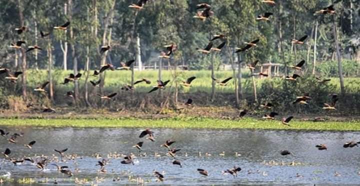 সরেজমিন দেখা যায়, শান্ত জলের বুকে কচুরিপানার সবুজ গালিচার মাঝে ঝাঁক বেঁধে ডানা মেলছে অতিথি পাখির দল। উড়ে চলা পাখির কিচির-মিচিরে মুখরিত চারপাশ। পিয়াং হাঁস, পাতি সরালি, লেঙজা হাঁস, বালি হাঁস, পাতিকূটসহ দেশি জাতের শামুকখোল, পানকৌড়ী, ছন্নি হাঁস বিল এলাকা মুখরিত করে তুলছে।