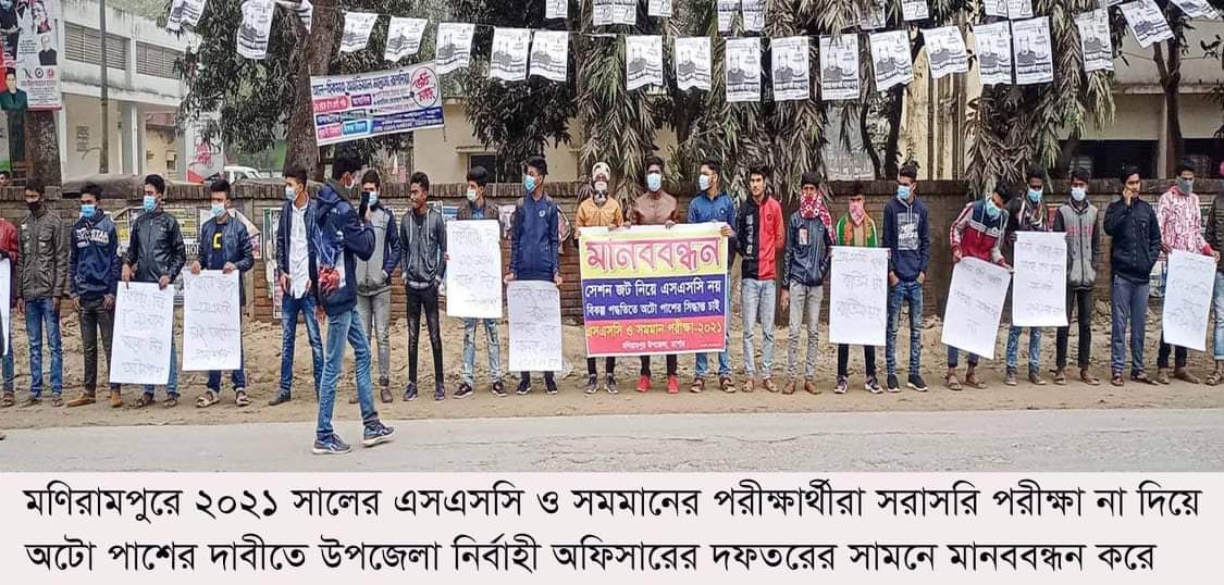 মণিরামপুর প্রতিনিধি: মণিরামপুরে চলতি বছর ২০২১ সালের এসএসসি ও সমমানের পরীক্ষার্থীরা সরাসরি পরীক্ষা না দিয়ে অটো পাশের দাবীতে মানববন্ধন করেছে। গতকাল রোববার সকাল ১০টায় মণিরামপুর উপজেলা নির্বাহী কর্মকর্তার অফিসের সামনে উপজেলার অর্ধশত শিক্ষার্থী পরীক্ষা না নিয়ে আটোপাশের বিভিন্ন লেখা সহকারে ব্যানার, প্লাকার্ড নিয়ে এ মানববন্ধন কর্মসূচীতে অংশ নেয়। চলতি বছরের ফেব্রæয়ারী মাসের মধ্যেই সংক্ষিপ্ত মুল্যায়ন পদ্ধতির মাধ্যমে এসএসসি ও সমমানের পরীক্ষার্থীদের অটোপাসের সিদ্ধান্ত দেয়ার দাবী জানান তারা।