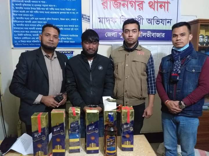 অগ্রযাত্রা সংবাদঃ মৌলভীবাজার জেলা গোয়েন্দা শাখার অফিসার ইনচার্জ সুধীন চন্দ্র দাশের পরিচালনা এবং সঙ্গীয় অফিসার এসআই/মোহাম্মদ মাসুক মিয়া, এসআই/কাজী আরিফ আহমেদ, এএসআই মকুন্দ দেববর্মা, কং/৮৩৮ মো. ইমরান হোসেন , কং/৭০২ আবুল বাছেদ রাফি, কং/১০২২ আতাউর রহমান, সকলেই জেলা গোয়েন্দা শাখা, মৌলভীবাজার এসআই জিতেন্দ্র বৈষ্ণব, মাদক বেরোধী সেল মৌলভীবাজারসহ মাদকদ্রব্য উদ্ধার ও বিশেষ অভিযান ডিউটি চলাকালীন সময় ০১/০২/২০২১ খ্রি. ১৮.৩০ ঘটিকার সময় মৌলভীবাজার জেলার রাজনগর থানার রাজনগর টু সিলেটগামী রোড এর ৩নং মুন্সিবাজারস্থ জয় টেলিকম নামীয় দোকানের সামনে পাকা রাস্তার উপর থেকে ০১ জন আসামী ধৃত করা হয়। ধৃত আসামীর নাম ১। লিটন সূত্রধর (২৬) পিতাঃ রানা সূত্রধর, সাং-করিমপুর, থানা- রাজনগর জেলা - মৌলভীবাজারকে ০৭ (সাত) টি বিদেশী মদের বোতলসহ গ্রেফতার করা হয়। তার বিরুদ্ধে আইনগত ব্যবস্থা নেওয়া হইতেছে।