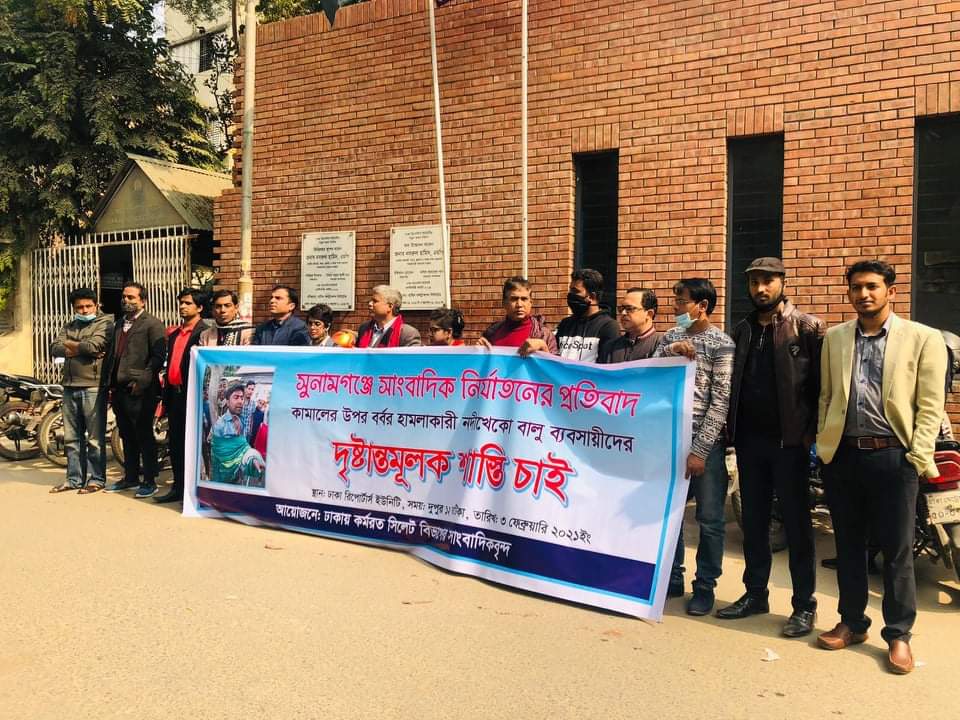 নিজস্ব প্রতিবেদকঃ সুনামগঞ্জের জাদুকাটা নদী থেকে অবৈধভাবে বালু উত্তোলনের ছবি তোলার কারণে সাংবাদিক কামাল হোসেনের উপর বর্বর হামলাকারীদের দৃষ্টান্তমূলক শাস্তির দাবিতে মানববন্ধন করেছেন ঢাকায় কর্মরত সিলেট বিভাগের সাংবাদিকরা।