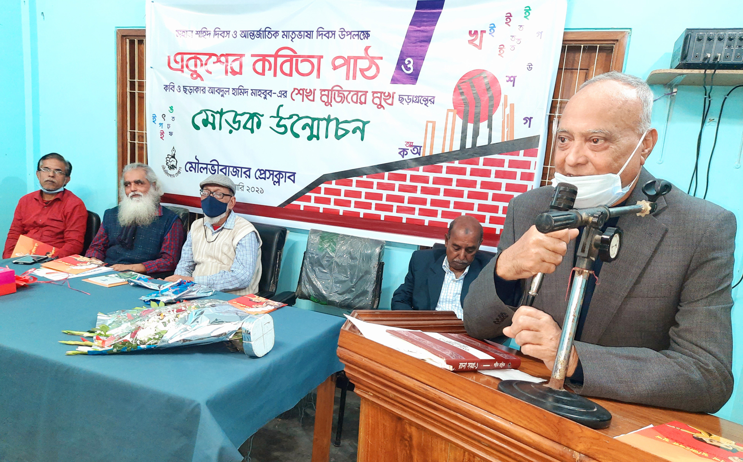মৌলভীবাজার প্রতিনিধি: মহান শহিদ দিবস ও আন্তর্জাতিক মাতৃভাষা দিবস উপলক্ষ্যে মৌলভীবাজার প্রেসক্লাবে একুশের কবিতাপাঠ ও কবি-ছড়াকার আবদুল হামিদ মাহবুবের ‘শেখ মুজিবের মুখ’ ছড়ার বইয়ের মোড়ক উন্মোচন করা হয়েছে। ২১ ফেব্রæয়ারি সন্ধ্যায় মৌলভীবাজার প্রেসক্লাব হলরুমে প্রেসক্লাবের সভাপতি এম এ সালামের সভাপতিত্বে ও সাংবাদিক সালাহ্ উদ্দিন ইবনে শিহাবের পরিচালনায় অনুষ্ঠানে স্বাগত বক্তব্য রাখেন প্রেসক্লাব সাধারণ সম্পাদক পান্না দত্ত। দুই পর্বের অনুষ্ঠানের প্রথম পর্বে একুশের কবিতা পাঠ করেন ষাটের দশকের শক্তিমান কবি শহিদ সাগ্নিক, অধ্যাপক আবদুল খালিক, কবি ও ছড়াকার আবদুল হামিদ মাহবুব, কবি ও কথাসাহিত্যিক আকমল হোসেন নিপু, কবি ও সাংবাদিক মৌসূফ এ চৌধুরী, কবি পুলক কান্তি ধর, কবি জাহাঙ্গীর জয়েস, কবি মহিদুর রহমান, কবি আহমদ আফরোজ, কবি মুজাহিদ আহমদ ও কবি জাবেদ ভূঁইয়া।অনুষ্ঠানে কবি আবু জাফর ওবায়দুল্লাহর ‘মাগো, ওরা বলে’ ও কবি সৈয়দ শামসুল হকের ‘আমার পরিচয়’ কবিতা আবৃত্তি করেন শিশু বাচিক শিল্পী তাওফিকা মুজাহিদ ত্বাহা।অনুষ্ঠানের দ্বিতীয় পর্বে কবি ও ছড়াকার আবদুল হামিদ মাহবুবের ’শেখ মুজিবের মুখ’ ছড়াগ্রন্থের মোড়ক উন্মোচন করা হয়। মোড়ক উন্মোচন শেষে বইয়ের উপর আলোচনা করেন মৌলভীবাজার পাবলিক লাইব্রেরির সাধারণ সম্পাদক প্রাবন্ধিক অধ্যাপক আব্দুল খালিক, সিনিয়র সাংবাদিক সরওয়ার আহমদ। বই নিয়ে কথা বলেন গ্রন্থকার আবদুল হামিদ মাহবুব। অন্যান্যের মধ্যে উপস্থিত ছিলেন মৌলভীবাজার প্রেসক্লাবের সিনিয়র সহসভাপতি নুরুল ইসলাম, সহসভাপতি অশোক কুমার দাশ, সাবেক সাধারণ সম্পাদক সালেহ এলাহি কুটি,মৌলভীবাজার টেলিভিশন জার্নালিস্ট অ্যাসোসিয়েশনের সাধারণ সম্পাদক বকশি মিছবাউর রহমান, কার্যকরী কমিটির সদস্য নূরুল ইসলাম, মামুনুর রশিদ মহসিন, পার্থ সারথি পালসহ কবি, সাহিত্যিক ও প্রেসক্লাবের সদস্যবৃন্দ।