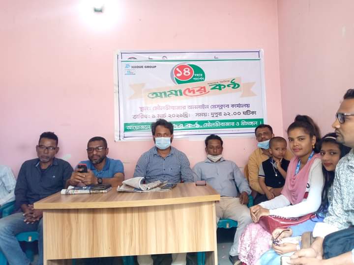 অগ্রযাত্রা সংবাদঃ মৌলভীবাজারে জনপ্রিয় সময়ের জাতীয় “দৈনিক আমাদের কন্ঠ” পত্রিকার ১৩ পেরিয়ে ১৪ বছরে পদার্পণ উপলক্ষে প্রতিষ্ঠা বার্ষিকী উদযাপন, কেক কাটা ও আলোচনা সভা অনুষ্ঠিত হয়েছে মৌলভীবাজার অনলাইন প্রেসক্লাব অফিস কার্যালয়ে আজ ১ মার্চ দুপুরে। দৈনিক আমাদের কন্ঠ পত্রিকার জেলা প্রতিনিধি মশাহিদ আহমদ এর সভাপতিত্বে ও দুর্নীতি মুক্তকরণ বাংলাদেশ ফোরাম জেলা শাখার সংগঠনিক সম্পাদক, সাংবাদিক চিনু রঞ্জন দাশ তালুকদার এর সঞ্চালনায় আয়োজিত অনুষ্টানে প্রধান অতিথি হিসাবে উপস্থিত ছিলেন- জাতীয় ভোক্তা অধিকার সংরক্ষণ অধিদপ্তর, মৌলভীবাজার জেলা কার্যালয় এর সহকারী পরিচালক মোঃ আল-আমিন। বিশেষ অতিথি হিসাবে উপস্থিত ছিলেন- দৈনিক মৌমাছি কণ্ঠ পত্রিকার সম্পাদক ও প্রকাশক শেখ সিরাজুল ইসলাম সিরাজ, মৌলভীবাজার অনলাইন প্রেসক্লাবের সভাপতি মোঃ জাফর ইকবাল, শ্রীমঙ্গল প্রেসক্লাবের সাবেক সহ-সভাপতি ইসমাইল মাহমুদ, বিশিস্ট ব্যাবসায়ী মহসিন উদ্দীন কাজল, দীপ্ত নিউজ সম্পাদক দুরুদ আহমেদ। বক্তব্য রাখেন- মৌলভীবাজার অনলাইন প্রেসক্লাবের সহ-সভাপতি সুধাাংশু শেখর হালদার, সাংগঠনিক সম্পাদক আব্দুল বাছিত খান, জয়যাত্রা টেলিভিশন এর বিশেষ প্রতিনিধি এ.কে অলক, দৈনিক আমাদের কন্ঠ পত্রিকার শ্রীমঙ্গল প্রতিনিধি সাকের আহমদ, দৈনিক করতোয়া পত্রিকার শ্রীমঙ্গল প্রতিনিধি সাগর আহমদ, দৈনিক গণমুক্তির কমলগঞ্জ প্রতিনিধি অঞ্জন প্রসাদ রায় চৌধুরী, শ্রীমঙ্গল প্রতিনিধি আলাল আহমদ, মঈনুল হক, কেএম সাইদুল ইসলাম, সাইফুল ইসলাম, শেখ কাদের আল হাসান, গোবিন্দ মল্লিক, এনআর মিডিয়া সম্পাদক নাছরিন প্রিয়া, সাইবারইিড২৪.কম সম্পাদক বদরুল হাসান জোসেফ, টাইম নিউজ সম্পাদক বিকাশ দাশ, সাংবাদিক রুবেল রানা চৌধুরী, আজিজুল ইসলাম, দৈনিক আলোকিত সকাল পত্রিকার ষ্টাফ বির্পোটার ফজলুর রহমান, রাহাত আহমদ সিফন, মাসুদ আলম চয়ন প্রমুখ। অনুষ্টানের শুরুতেই প্রধান অতিথি ও বিশেষ অতিথিবৃন্দকে বরণ করে নেন দৈনিক আমাদের কন্ঠ পত্রিকা পরিবারের সদস্যরা।