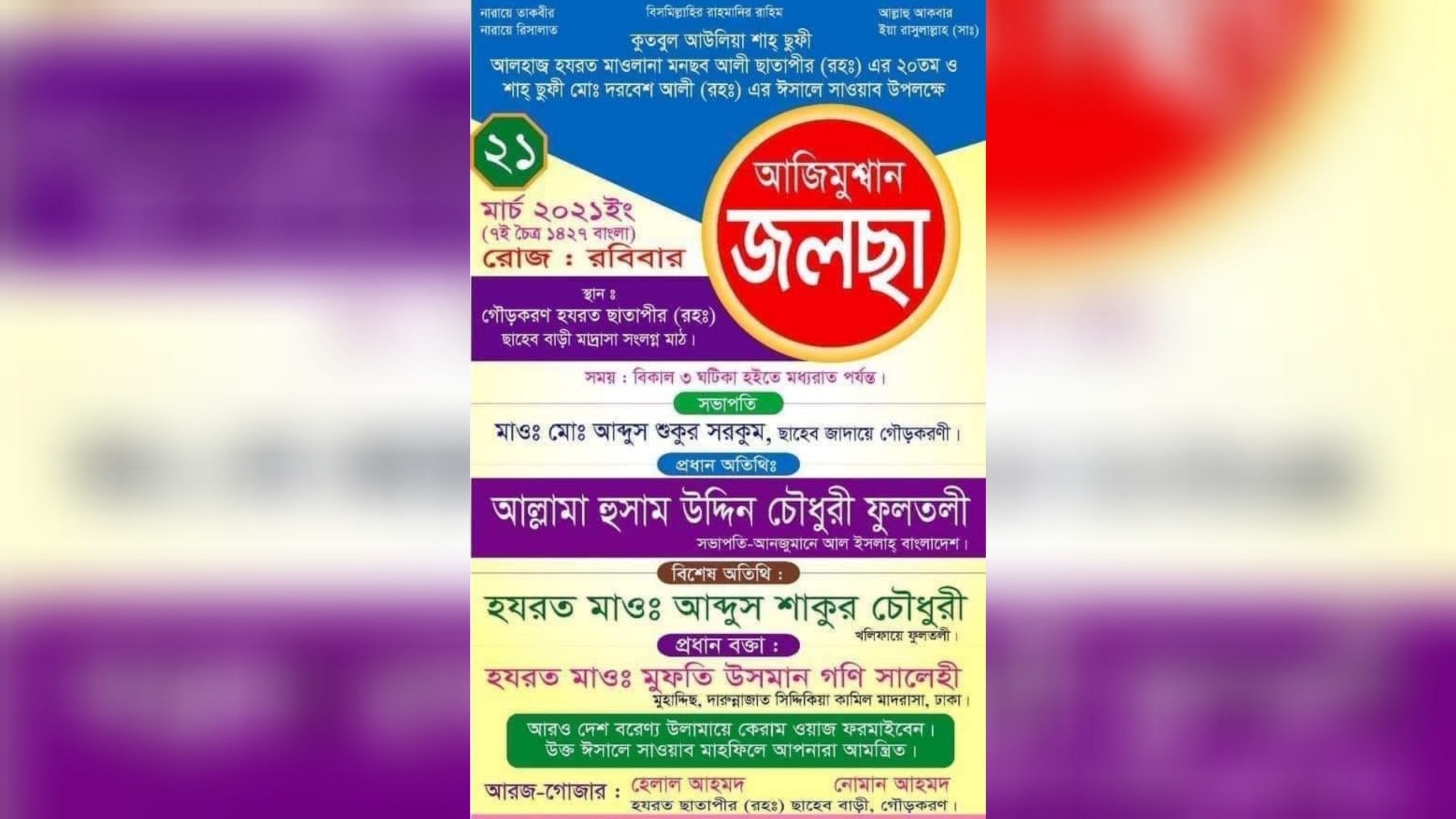 মোঃ আজিজুল ইসলাম::কুলাউড়ায় কুতবুল আউলিয়া শাহ্ ছুফী আলহাজ্ব হযরত মাওলানা মনছব আলী ছাতাপীর (র.) এর ২০ তম ও শাহ্ ছুফী মোঃ দরবেশ আলী (র.) এর ইসালে সওয়াব উপলক্ষে আজিমুশ্বান জলসা অনুষ্ঠিত হবে। রবিবার (২১ মার্চ) বিকাল থেকে মধ্যরাত পর্যন্ত গৌড়করন হযরত ছাতাপীর (র.) ছাহেব বাড়ি মাদরাসা সংলগ্ন মাঠে অনুষ্ঠিত এ মাহফিলে প্রধান অতিথি হিসেবে উপস্থিত থাকবেন,বাংলাদেশ আনজুমানে আল ইসলাহ'র সভাপতি আল্লামা হুসাম উদ্দিন চৌধুরী ফুলতলী।বিশেষ অতিথি খলিফায়ে ফুলতলী হযরত মাওলানা আব্দুশ শুকুর চৌধুরী, প্রধান বক্তা দারুন্নাজাত সিদ্দিকিয়া কামিল মাদরাসার মুহাদ্দিস মাওলানা ওসমান গনি সালেহী। এছাড়াও দেশ বরেণ্য ওলামায়ে কেরামগণ ওয়াজ করবেন। আজিমুশ্বান জলসার সভাপতি মাওলানা আব্দুস শুকুর সরকুম জানান, প্রতিবছরের ন্যায় এবারও শত শত মুরিদিন-মুহিব্বিন ও ধর্মপ্রাণ মুসলমান গৌড়করন ছাহেব বাড়িতে ঈসালে সওয়াব মাহফিলে সমবেত হবেন। মাহফিলকে সুন্দর ভাবে সফল করার জন্য সকল প্রস্তুতি ইতিমধ্যে সম্পন্ন হয়েছে। তিনি সর্বস্থরের জনসাধারনকে মুবারক মাহফিলে যোগদানের আহবান জানান।