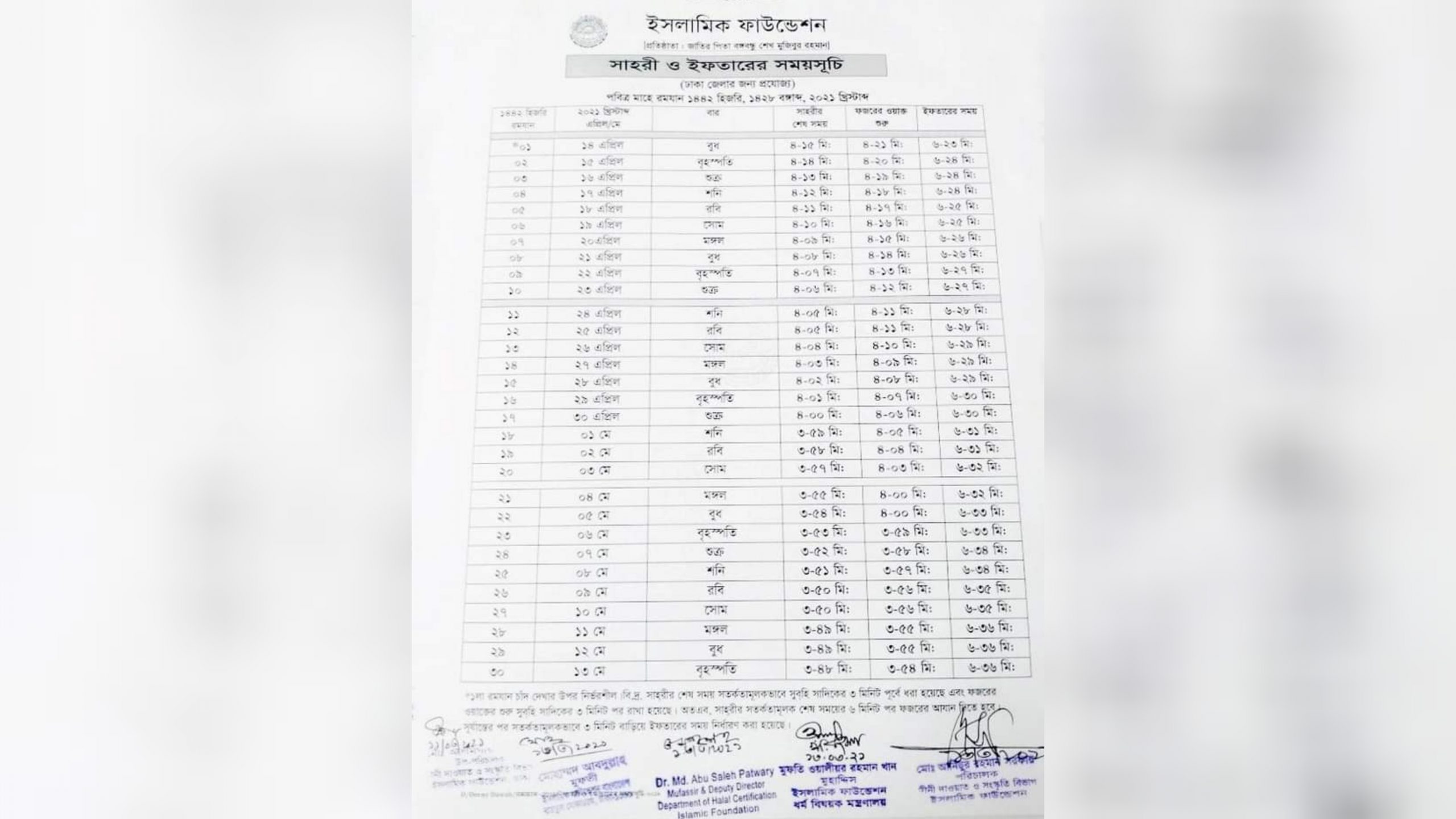 পবিত্র মাহে রামাদ্বানের সেহরি ও ইফতারের সময়সূচি প্রকাশ