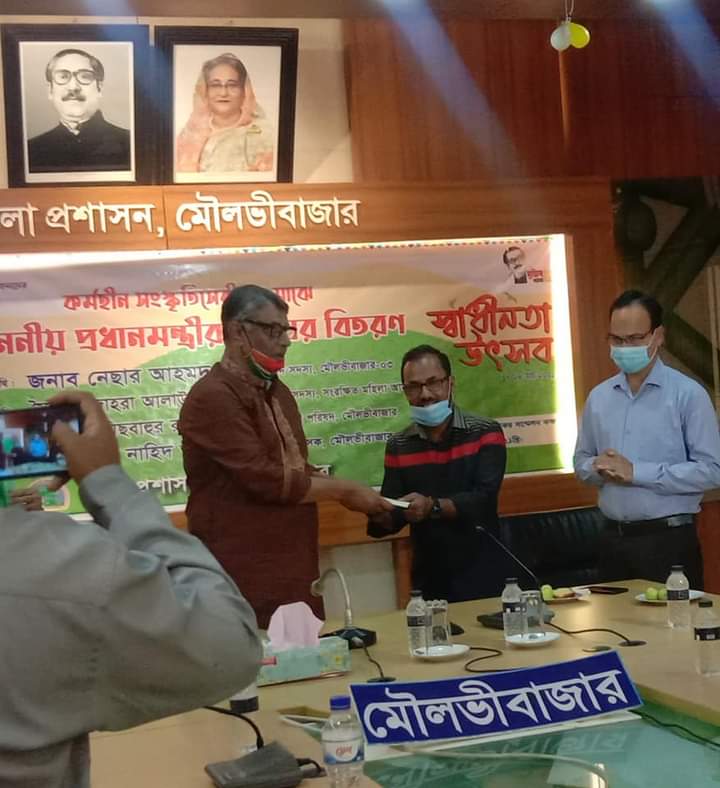 অগ্রযাত্রা সংবাদঃ মৌলভীবাজারে ১২ দিনব্যাপী স্বাধীনতা উৎসবের ৫ম দিনে প্রধানমন্ত্রীর উপহার পেয়েছেন কর্মহীন সংস্কৃতিসেবীরা। রোববার মৌলভীবাজার জেলা প্রশাসনের আয়োজনে জেলা প্রশাসক সম্মেলন কক্ষে জেলার কর্মহীন সংস্কৃতিসেবীদের প্রধানমন্ত্রীর এই উপহার দেওয়া হয়। অতিরিক্ত জেলা প্রশাসক মামুনূর রশীদের সভাপতিত্বে কর্মহীন সংস্কৃতিসেবীদের হাতে চেক তুলে দেন মৌলভীবাজার-৩ আসনের সংসদ সদস্য নেছার আহমদ। এ সময় আরও উপস্থিত ছিলেন সংরক্ষিত নারী আসনের সংসদ সদস্য সৈয়দা জোহরা আলাউদ্দিন। এ সময় জেলার ৫৯ জন কর্মহীন সংস্কৃতিসেবীদের মাঝে প্রধানমন্ত্রীর উপহার দেওয়া হয়েছে। প্রত্যেকে দশ হাজার টাকা করে পেয়েছেন।