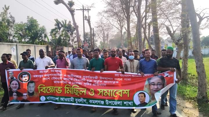 কমলগঞ্জ প্রতিনিধি: মৌলভীবাজারের কমলগঞ্জে বঙ্গবন্ধুর জন্মশতবার্ষিকী ও স্বাধীনতার সুবর্ণজয়ন্তী উদযাপনকালে সারা দেশে মৌলবাদী জামাত-বিএনপি চক্র কর্তৃক ধ্বসাত্মক তান্ডবলীলা ও নৈরাজ্য সৃষ্ঠির প্রতিবাদে বিক্ষোভ মিছিল ও পথসভা করেছে কমলগঞ্জ উপজেলা যুবলীগ। আজ শনিবার বিকাল ৩টায় এ বিক্ষোভ মিছিল ও পথসভা করা হয়। কমলগঞ্জ পৌর মেয়র ও উপজেলা যুবলীগের আহবায়ক মো: জুয়েল আহমেদ এর নেতৃত্বে বিক্ষোভ মিছিলটি ভানুগাছ বাজারের প্রধান প্রধান সড়ক প্রদক্ষিণ করে। বিক্ষোভ মিছিল শেষে ভানুগাছ বাজার চৌমুহনায় পথসভা অনুষ্ঠিত হয়।