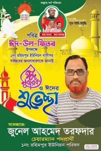 আসুন, হাতে হাত রেখে, কাঁধে কাঁধ মিলিয়ে সকল ভেদাভেদ, ক্রোধ, হিংসা ভুলে পাড়া, মহল্লা, গ্রাম, ইউনিয়নের উন্নয়নে অবদান রাখার লক্ষে সকলে মিলে ধৈর্যধারণ করে এবং ঝগড়া বিহীন মামলা বিহীন শান্তিপূর্ণ সুন্দর ১নং রহিমপুর ইউনিয়নকে মডেল ইউনিয়ন গড়ে তুলার প্রত্যয়ে, সমগ্র বাংলাদেশের মধ্যে এই ইউনিয়নটি গর্বের সাথে মাথা উচু করে অবস্থান করুক একমাত্র এ প্রত্যাশা নিয়ে আসন্ন ইউনিয়ন পরিষদ নির্বাচনে ১নং রহিমপুর ইউনিয়নে চেয়ারম্যান প্রার্থী হিসাবে আপনাদের দোয়া ভালোবাসা ও সার্বিক সহযোগিতা কামনা করি এবং সবাইকে পবিত্র ঈদুল ফিতরের শুভেচ্ছা ও অভিনন্দন জানাই।