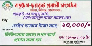 বড়চেগ ছয়কুট প্রবাসী সংগঠনের পক্ষ থেকে চিকিৎসার জন্য নগদ অর্থ সহায়তা প্রদান