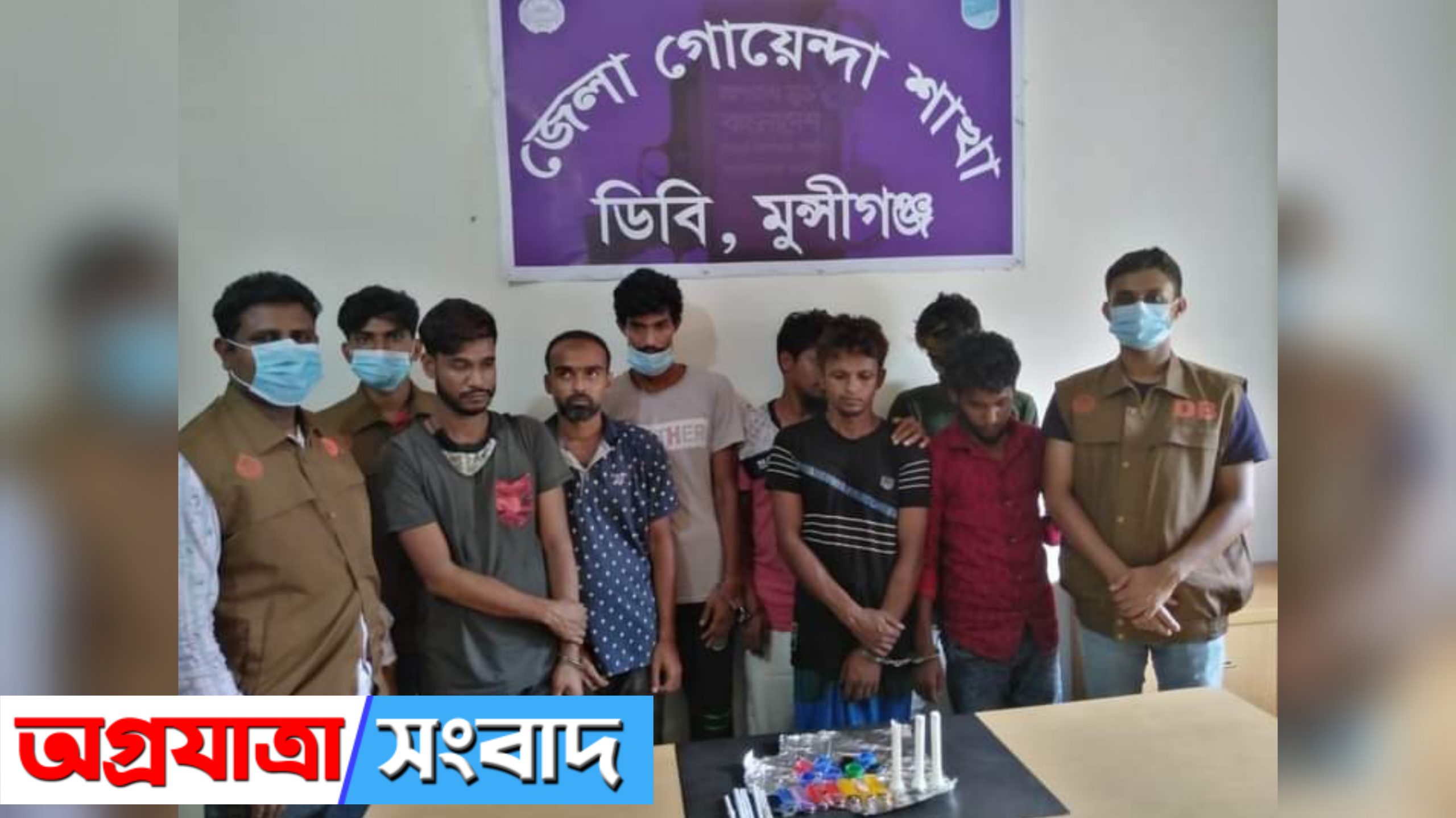 মুন্সিগঞ্জঃঃ মুন্সীগঞ্জ জেলা পুলিশ সুপার আব্দুল মোমেন পিপিএম এর নির্দেশে অতিরিক্ত পুলিশ সুপার (অপরাধ ও প্রশাসন) সুমন দেবের তদারকিতে জেলা ডিবি পুলিশের অফিসার ইনচার্জ (ওসি) আবুল কালাম আজাদের নেতৃত্বে মঙ্গলবার (৬ জুলাই) বিকাল ৩ টা ১৫ মিনিটের সময় সঙ্গীয় অফিসার ফোর্স নিয়ে গোপন সংবাদের নেতৃত্বে সদর থানার পঞ্চসার ইউনিয়নের নয়াগাঁও এলাকার ইসমাইল মোল্লার চৌচালা টিনের ঘরের ভিতর তল্লাশি করে মাদক সেবন অবস্থায় ৭ জনকে গ্রেপ্তার করেন।