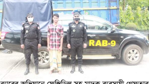 অগ্রযাত্রা সংবাদ ঃ র্যাব-৯ এর অভিযানে সিলেট জেলার কোম্পানীগঞ্জ থানাধীন এলাকা থেকে ফেন্সিডিল সহ ০১ জন পেশাদার মাদক ব্যবসায়ী গ্রেফতার। ০৫ আগস্ট ২০২১ ইং তারিখ ১২.৪০ ঘটিকার সময় গোপন সংবাদের ভিত্তিতে র্যাপিড এ্যাকশন ব্যাটালিয়ন-৯, সদর কোম্পানী (সদর ক্যাম্প, সিলেট) এর একটি আভিযানিক দল লেঃকর্ণেল আবু মুসা মোঃ শরীফুল ইসলাম, পিএসসি, এএসসি (অধিনায়ক র্যাব-৯), মেজর মাহফুজুর রহমান এবং এএসপি সোমেন মজুমদার এর নেতৃত্বে সঙ্গীয় ফোর্সসহ সিলেট জেলার কোম্পানীগঞ্জ থানাধীন রনীখাই ইউনিয়নের হায়দরী বাজারের বিলালের মুরগী দোকানের সামনে পাকা রাস্তার উপর হইতে অভিযান পরিচালনা করে ক। ফেন্সিডিল=৮০ বোতল, খ। মোবাইল=০১ টি, গ। সীম কার্ড=০২ টি জব্দসহ ধৃত আসামী ১। মোঃ মমিন (২০), পিতা- মোঃ শাহজাহান মিয়া, সাং- চামুরা, থানা- কোম্পানীগঞ্জ, জেলা- সিলেট’কে গ্রেফতার করে। পরবর্তী আইনগত ব্যবস্থা গ্রহণ করার লক্ষ্যে মাদকদ্রব্য নিয়ন্ত্রণ আইন; ২০১৮ এর ৩৬(১) এর ১৪(গ) ধারায় মামলা দায়ের পূর্বক আসামী ও জব্দকৃত আলামত সহ সিলেট জেলার কোম্পানীগঞ্জ থানায় হস্তান্তর করা হয়েছে।