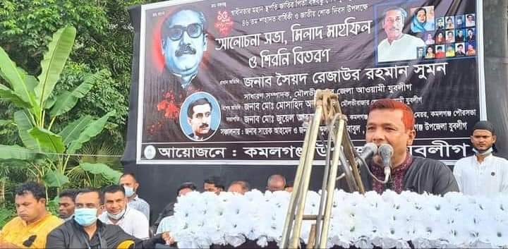 জাতির জনক বঙ্গবন্ধু শেখ মুজিবুর রহমানের শাহাদাৎ বার্ষিকী ও জাতীয় শোক দিবস উপলক্ষে কমলগঞ্জ উপজেলা যুবলীগের উদ্যোগে রোববার বিকাল ৪টায় উপজেলা যুবলীগের আহবায়ক ও পৌর মেয়র মো: জুয়েল আহমেদ এর সভাপতিত্বে পৌর মেয়রের ব্যক্তিগত কার্যালয়ের সামনে এক আলোচনা সভা, মিলাদ ও দোয়া মাহফিল ও শিরনী বিতরণ অনুষ্ঠিত হয়। প্রধান অতিথি হিসেবে উপস্থিত ছিলেন মৌলভীবাজার জেলা যুবলীগের সাধারণ সম্পাদক সৈয়দ রেজাউর রহমান সুমন।