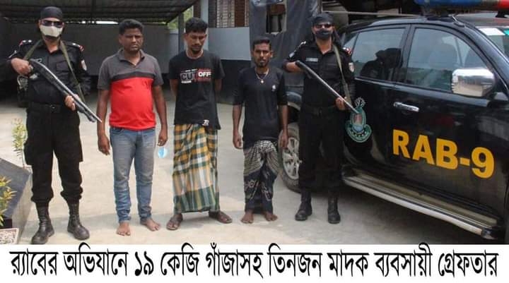 ০৫ সেপ্টেম্বর ২০২১ ইং তারিখ ০৫:৫০ ঘটিকার সময় গোপন সংবাদের ভিত্তিতে র্যাব-৯, সিপিসি-১ (হবিগঞ্জ ক্যাম্প) এর একটি আভিযানিক দল লেঃ কমান্ডার মোহাম্মদ নাহিদ হাসান এবং সিনিঃ এএসপি এ,কে,এম কামরুজ্জামান এর নেতৃতে হবিগঞ্জ জেলার চুনারুঘাট থানাধীন চন্দনা কলেজ রোড চুনারুঘাট পৌরসভার ০৯ নং ওয়ার্ড রফিক ম্যানসন এর পূর্ব পার্শে^ পাকা রাস্তার উপর অভিযান পরিচালনা করে ক। গাঁজা=১৯(উনিশ) কেজি, খ। মোবাইল=০৩ টি, গ। সীমকার্ড=০৩ টি জব্দসহ ধৃত আসামী ১। ১। ঊামস দাস (৩৭) পিতা- বসুন দাস, সাং- মাখাল কান্দি (বসুন দাসের বাড়ী), ২। মোঃ সোহেল মিয়া, (৪০) পিতা- মৃত কালা মিয়া, সাং- পুকরা দৌলতপুর, ৩। মোঃ এলাছ মিয়া, (৩৮) পিতা- মৃত কালাই মিয়া, সাং- পুকরা দৌলতপুর, সর্বথানা- বানিয়াচং, জেলা- হবিগঞ্জগণ’কে গ্রেফতার করে। পরবর্তী আইনগত ব্যবস্থা গ্রহণ করার লক্ষ্যে মাদকদ্রব্য নিয়ন্ত্রণ আইন, ২০১৮ এর ৩৬(১) এর টেবিল ১৯(গ)/৪১ ধারায় মামলা দায়ের করে গ্রেফতারকৃত আসামীগণ এবং আলামত হবিগঞ্জ জেলার চুনারুঘাট থানায় হস্তান্তর করা হয়েছে।