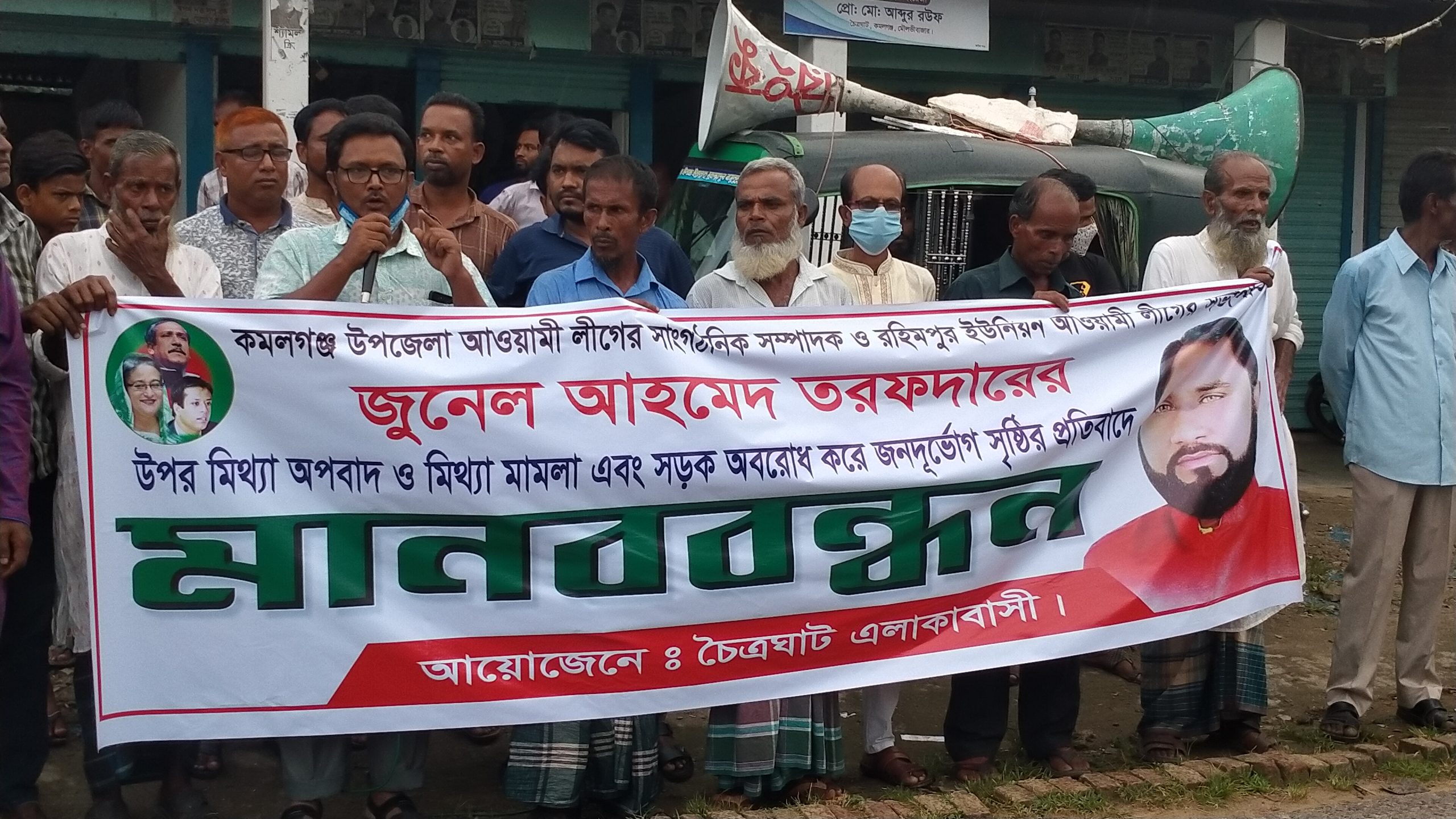 মৌলভীবাজারের কমলগঞ্জ উপজেলা আওয়ামীলীগের সাংগঠনিক সম্পাদক ও ১নং রহিমপুর ইউনিয়নের সভাপতি জুনেল আহমেদ তরফদার উপর মিথ্যা অপবাদ, মামলা ও সড়ক অবরোধ করে জনদূর্ভোগ সৃষ্টির প্রতিবাদে মানববন্ধন কর্মসূচি পালন করা হয়েছে। ১৪ সেপ্টেম্বর মঙ্গলবার বিকাল ৪টায় কমলগঞ্জ উপজেলার ১নং রহিমপুর ইউনিয়নের চৈত্রঘাট এলাকাবাসীর আয়োজনে মৌলভীবাজার- শমশেরনগর রোডের চৈত্রঘাট বাজারে প্রায় ৩ শতাধিক জনসাধারণের উপস্থিতিতে এ মানববন্ধন কর্মসূচিতে বক্তব্য রাখেন উপজেলা আওয়ামীলীগের সহ দপ্তর সম্পাদক হামিদুল হক চৌধুরী বাবর, চৈত্রঘাট বাজার ব্যবসায়ী সমিতির সভাপতি নাজমুল হাসান, সহসভাপতি আকলিছ মিয়া, মুন্সীবাজার ব্যবসায়ী সমিতির সাধারন সম্পাদক শফিকুল ইসলাম, হাসান চৌধুরী, পারভেজ আহমদ, ছাত্রলীগ সভাপতি এমদাদুল হক প্রমুখ।