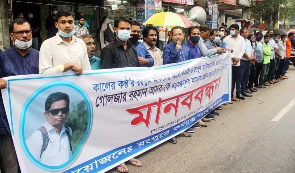 কালের কণ্ঠ রংপুর অফিসের আলোকচিত্রী গোলজার রহমান আদরকে গ্রেপ্তারের প্রতিবাদে ও মুক্তির দাবীতে রংপুরে কর্মরত সাংবাদিকদের আয়োজনে মানববন্ধন অনুষ্ঠিত হয়েছে। শনিবার (১৮ সেপ্টেম্বর) বেলা ১২ টায় রংপুর প্রেসক্লাবের সামনে অনুষ্ঠিত মানববন্ধনে রংপুরে কর্মরত সাংবাদিকও বিভিন্ন সাংবাদিক সংগঠনের নেতৃবৃন্দ উপস্থিত ছিলেন।