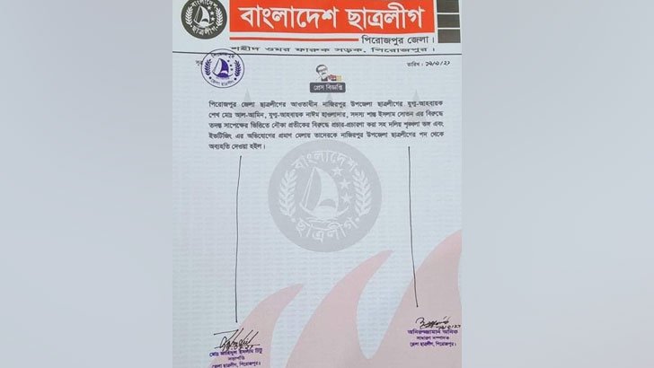ইউনিয়ন পরিষদ নির্বাচনে নৌকা মার্কার প্রার্থীর বিরুদ্ধে প্রচার-প্রচারণা করাসহ দলীয় শৃঙ্খলা ভঙ্গের অভিযোগ তুলে পিরোজপুরের নাজিরপুর উপজেলা ছাত্রলীগের ৩ নেতাকে বহিষ্কার করেছে জেলা ছাত্রলীগ। রোববার রাতে জেলা ছাত্রলীগের সভাপতি জাহিদুল ইসলাম টিটু ও সাধারণ সম্পাদক অনিরুজ্জামান অনিক স্বাক্ষরিত এক প্রেস বিজ্ঞপ্তিতে এই তথ্য জানানো হয়। বহিষ্কৃতরা হলো- নাজিরপুর উপজেলা ছাত্রলীগের যুগ্ম আহ্বায়ক শেখ মো. আল-আমিন, যুগ্ম আহ্বায়ক নাঈম হাওলাদার ও সদস্য শান্ত ইসলাম সোভন। এ বিষয়ে পিরোজপুর জেলা ছাত্রলীগের সভাপতি জাহিদুল ইসলাম টিটু যুগান্তরকে বলেন, তাদের বিরুদ্ধে ইউনিয়ন নির্বাচনে নাজিরপুর উপজেলা আওয়ামী লীগ সমর্থিত নৌকা মার্কার প্রার্থীদের বিরুদ্ধে গিয়ে বিদ্রোহী প্রার্থীর পক্ষে প্রচারণা, নৌকা মার্কার প্রার্থী নাজিরপুর উপজেলা আওয়ামী লীগের সাধারণ সম্পাদক মোশারফ হোসেন খানকে লাঞ্ছিত ও তার মেয়েকে শ্লীলতাহানির অভিযোগ ছিল। জেলা ছাত্রলীগ তদন্ত করে অভিযোগের সত্যতা পাওয়ায় তাদেরকে অব্যাহতি দেওয়া হয়েছে। তবে এ বিষয়ে অব্যাহতিপ্রাপ্ত তিন নেতার বক্তব্য নেওয়া সম্ভব হয়নি।