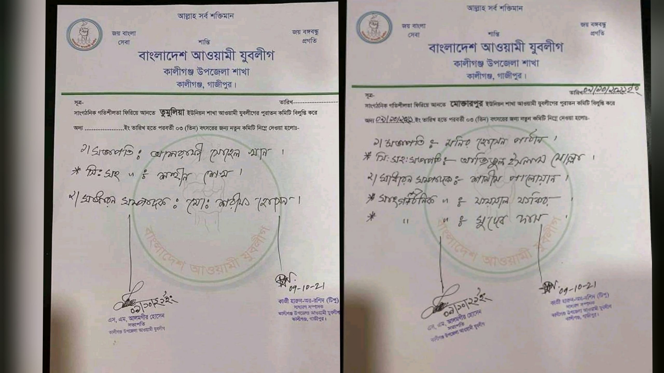 গতকাল ০৯/১০/২০২১ইং রোজ শনিবার, কালীগঞ্জ উপজেলা আওয়ামী যুবলীগ সভাপতি এস এম আলমগীর এবং সাধারণ সম্পাদক হারুন অর রশিদ টিপুর যৌথ স্বাক্ষরিত উপজেলা যুব লীগের প্যডে ০৪ টি ইউনিয়ন এর কমিটি ঘোষনা করা হয়।০৪ টি ইউনিয়ন এর মধ্য তুমুলিয়া,বক্তারপুর,জাঙ্গালিয়া,ও মোক্তারপুর,।তুমুলিয়া ইউনিয়ন আওয়ামী যুবলীগ এর সভাপতি হিসাবে নির্বাচিত হন,