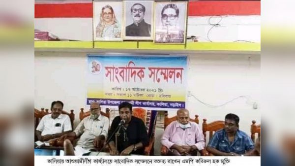 নড়াইলের কালিয়ায় আওয়ামীলীগের বর্ধিত সভায় এমপি কবিরুল হক (মুক্তির) বিরুদ্ধে হামলার অভিযোগ এনে সাংবাদ সম্মেলনে জেলা আওয়ামীলীগের সাধারণ সম্পাদক নিজামুদ্দিন খান নিলু মিথ্যাচার করেছেন বলে অভিযোগ করেছেন নড়াইলে-১ এর সাংসদ বি, এম, কবিরুল হক মুক্তি। এ উপলক্ষ্যে ১৭ অক্টোবর (রোববার) সকাল ১১ টায় উপজেলা আওয়ামীলীগের দলীয় কার্য্যালয়ে এক সংবাদ সম্মেলনের আয়োজন করেন তিনি। এ সময় উপস্থিত ছিলেন কালিয়া পৌর সভার সাবেক মেয়র ফকির মুশফিকুর রহমান লিটন, নড়াইল জেলা আওয়ামীলীগের সহসভাপতি বীর মুক্তিযোদ্ধা মোল্যা ইমদাদুল ইসলাম, সাবেক পৌর মেয়র এমদাদুল হক টুলু উপজেলা সাবেক মুক্তিযোদ্ধা কমান্ডার শেখ তরিকুল আলম মুন্নু, উপজেলা পরিষদের ভাইচ চেয়ারম্যান, ইব্রাহীম শেখ, উপজেলা যুবলীগের আহ্বায়ক খান রবিউল ইসলাম, যুগ্ম আহ্বায়ক আশীষ ভট্টাচার্যসহ দলীয় নেতাকর্মীরা।