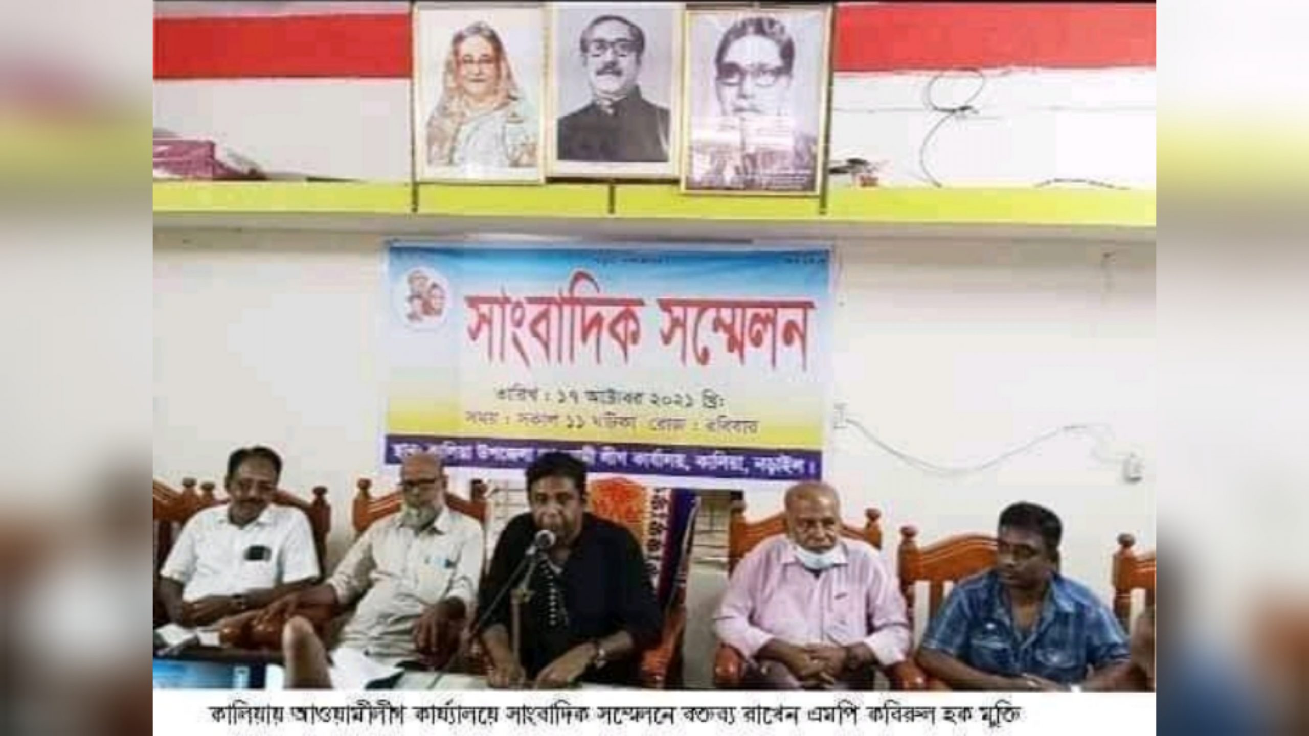 নড়াইলের কালিয়ায় আওয়ামীলীগের বর্ধিত সভায় এমপি কবিরুল হক (মুক্তির) বিরুদ্ধে হামলার অভিযোগ এনে সাংবাদ সম্মেলনে জেলা আওয়ামীলীগের সাধারণ সম্পাদক নিজামুদ্দিন খান নিলু মিথ্যাচার করেছেন বলে অভিযোগ করেছেন নড়াইলে-১ এর সাংসদ বি, এম, কবিরুল হক মুক্তি। এ উপলক্ষ্যে ১৭ অক্টোবর (রোববার) সকাল ১১ টায় উপজেলা আওয়ামীলীগের দলীয় কার্য্যালয়ে এক সংবাদ সম্মেলনের আয়োজন করেন তিনি। এ সময় উপস্থিত ছিলেন কালিয়া পৌর সভার সাবেক মেয়র ফকির মুশফিকুর রহমান লিটন, নড়াইল জেলা আওয়ামীলীগের সহসভাপতি বীর মুক্তিযোদ্ধা মোল্যা ইমদাদুল ইসলাম, সাবেক পৌর মেয়র এমদাদুল হক টুলু উপজেলা সাবেক মুক্তিযোদ্ধা কমান্ডার শেখ তরিকুল আলম মুন্নু, উপজেলা পরিষদের ভাইচ চেয়ারম্যান, ইব্রাহীম শেখ, উপজেলা যুবলীগের আহ্বায়ক খান রবিউল ইসলাম, যুগ্ম আহ্বায়ক আশীষ ভট্টাচার্যসহ দলীয় নেতাকর্মীরা।