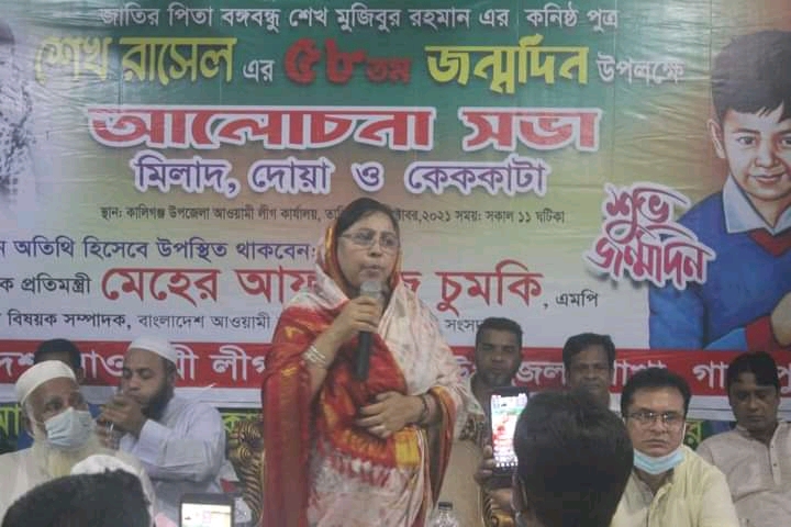 বিকাল ০৪ টার সময় কালীগন্জ আওয়ামীলীগ এর পার্টি অফিসে শেখ রাসেল এর ৫৮ তম জন্মদিন উপলক্ষে আলোচনা সভা এবং মিলাদ ও দোয়া অনুষ্টিত হয়,কালীগন্জ উপজেলা আআওয়ামীলীগ এর ভারপ্রাপ্ত সভাপতি আব্দুল মতিন সরকার এর সভাপতিত্বে, কালীগন্জ আওয়ামীলীগ এর সাধারন সম্পাদক এইচ এম আবুবক্কর এর সন্চলনায় পবিত্র কোরআন তেলোয়াত এর মধ্য দিয়ে শুরু আলোচনা সভা,উক্ত সভায় প্রাধান অতিথি হিসাবে উপস্হিত ছিলেন বাংলাদেশ আওয়ামীলীগ এর কেন্দ্রীয় কমিটির মহিলা বিষয়ক সম্পাদক ও কালীগন্জ এর মাটি ও মানুষ এর প্রান এর নেএী গাজীপুর ০৫ আসন এর মাননীয় সংসদ মেহের আফরোজ চুমকি এমপি,বিশেষ অতিথি হিসাবে উপস্হিত ছিলেন,গাজীপুর জেলা আওয়ামীলীগ এর যুগ্ম সাধারণ সম্পাদক এড: আশরাফী মেহেদী হাসান,কালীগন্জ পৌর মেয়র ও পৌর আওয়ামীলীগ এর সভাপতি এস,এম রবিন হোসেন, আরো উপস্হিত ছিলেন কালীগন্জ উপজেলা আওয়ামীলীগ এর সহ -সভাপতি বাবু পরিমল চন্দ্র ঘোষ,কালীগন্জ উপজেলা চেয়ারম্যান মোয়াজ্জেম হোসেন পলাশ,উপজের ভাইস- চেয়ারম্যান এড:মাকসুদুল আলম খাঁন,কালীগন্জ উপজেলা মহিলা ভাইস-চেয়ারম্যান শর্মীলি রোজারিও,কালীগন্জ উপজেলা আওয়ামীলীগ এর যুগ্ম -সাধারণ সম্পাদক মো:দেলোয়ার হোসেন দুলাল,উপদেষ্টা মো:দেলোআর হোসেন,কালীগন্জ উপজেলা আওয়ামীসেচ্ছাসেবক লীগ এর সভাপতি রফিকুল ইসলাম সিজু,গাজীপুর জেলাপরিষদ এর সদস্য শফিউল কাদের নান্নু,জেলাপরিষদ এর সদস্য তাসলীমা রহমান লাভলী,কালীগন্জ উপজেলা মহিলা লীগ এর সভাপতি জুয়েনা আহমেদ, কালীগন্জ পৌর আওয়ামীলীগ এর সাধারণ সম্পাদক মো:কামরুল ইসলাম, কালীগন্জ উপজেলা যুবলীগ এর সভাপতি এস,এম,আলমগীর,সাধারণ সম্পাদক হারুন উর রশিদ টিপু,কালীগন্জ উপজেলা আওয়ামীলীগ এর অর্থ বিষয়ক সম্পাদক শরিফুুল ইসালাম খাঁন কনক,আফসার হোসেন,রাজ,কালীগন্জ পৌর যুবলীগ এর সভাপতি মো:বাদল মিয়া,সাধারণ সম্পাদক আশরাফী রেজাউর রহমান খোকন,যুবলীগ নেতা আজাদ ফয়সাল সাজ্জাদ,শ্রমিক লীগএর দপ্তর সম্পাদক নুরুজ্জামান ভূইয়া,গাজীপুর জেলা আওয়ামী প্রজন্ম লীগএর সভাপতি মতিন খান,সহ কালীগন্জ উপজেলা আওয়ামীলীগ এর অঙ্গ সংগঠন এর নেতৃবৃন্দ, আলোচনা শেষে মিলাদ ও দোয়া পরিচালনা করেন,বালীগাঁও বড়বাড়ি জামে মসজিদ এর ইমাম ও খতিব মাওলানা আবু হানিফ,দেশ ও জাতির জন্য বিশেষ দোয়া করেন,মাননীয় প্রাধান মন্ত্রী জননেএী শেখ হাসিনার পরিবারএর জন্য,এবং মেহের আফরোজ চুমকি আপার পরিবারএর জন্য শান্তি কামনা করে,দেশ বাসীর কল্যাণ এর জন্য দোয়া কামনা করেন,দোয়া শেষে কেক কাটার মধ্যদিয়ে আলোচনা ও মিলাদ ও দোয়া মহফিল এর অনুষ্টান সপ্তাতির পূর্বে তবারক বিতরন করা হয়।
