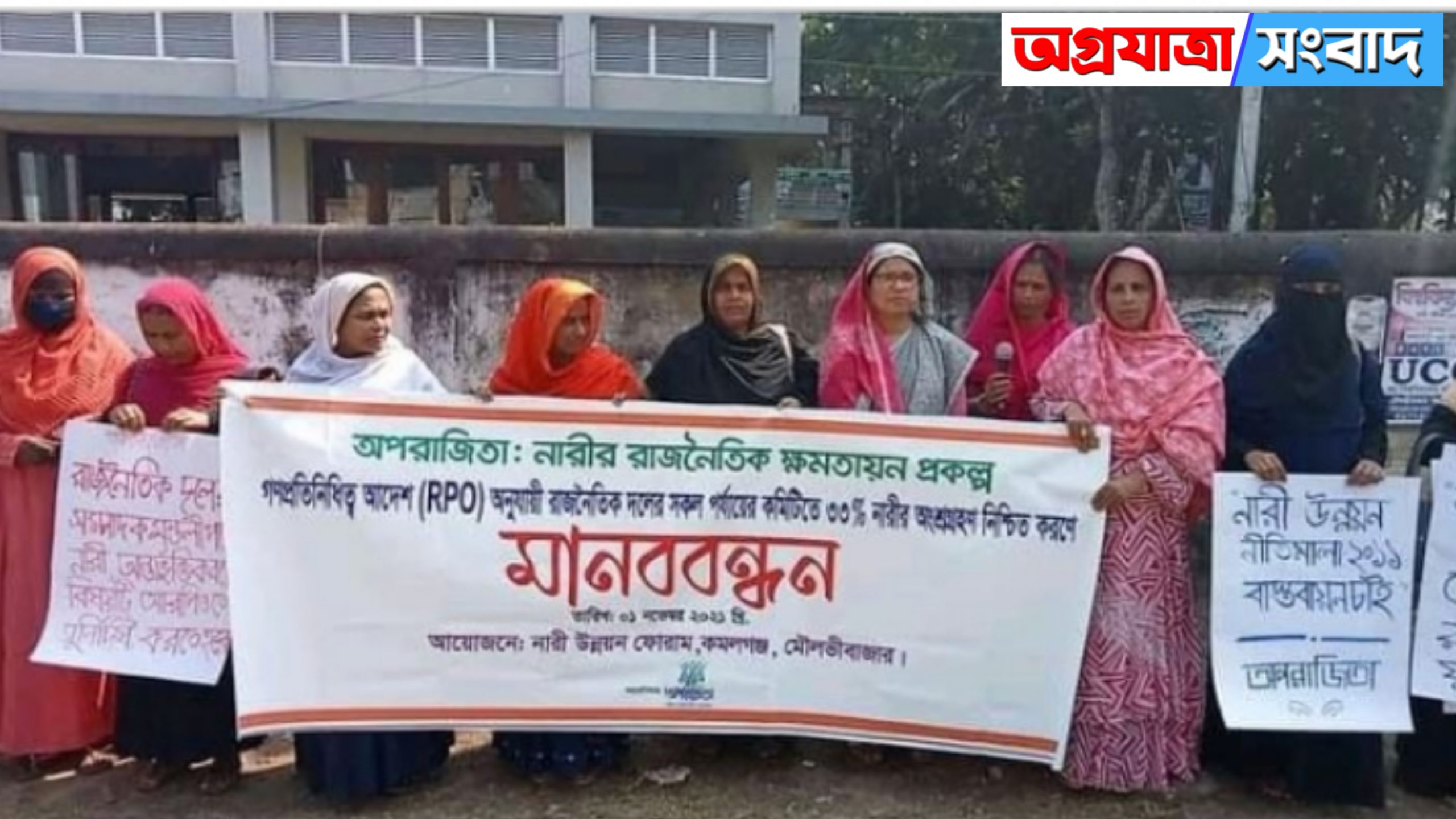 কমলগঞ্জ প্রতিনিধি ঃগণপ্রতিনিধিত্ব আদেশ অনুযায়ী বিভিন্ন রাজনৈতিক দলের সকল পর্যায়ের কমিটিতে শতকরা ৩৩ ভাগ নারীদের অন্তর্ভূক্ত করার দাবীতে মৌলভীবাজারের কমলগঞ্জে মানববন্ধন কর্মসূচি পালিত হয়েছে।সোমবার (১ নভেম্বর) সকাল ১১টায় কমলগঞ্জ উপজেলা নারী উন্নয়ন ফোরামের আয়োজনে ও প্রিপ ট্রাস্ট, অপরাজিতা প্রকল্পের সহযোগিতায় উপজেলা পরিষদ প্রাঙ্গনে এ মানববন্ধন অনুষ্ঠিত হয়।