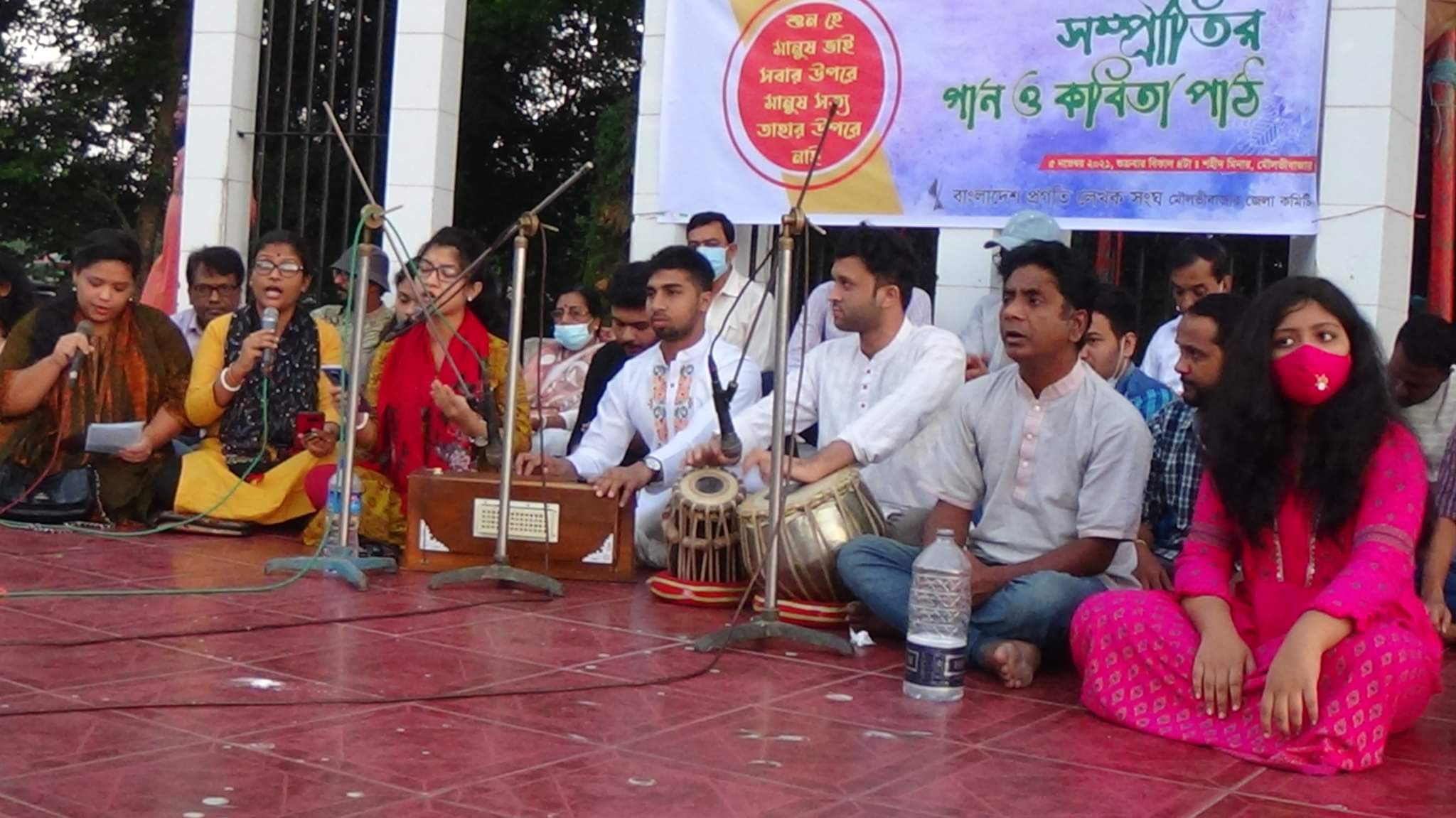 অনুষ্ঠানে সম্প্রীতির গান পরিবেশন করেন গণ–সঙ্গীতশিল্পী মীর ইউসুফ আলী, রোবাইয়াত ইউসুফ অর্নি, অরুণ দাস, নির্বেন্দু নির্ধূত তপু, সুরঞ্জিত সুরণ, প্রিয়তা চৌধুরী, মৌমিতা সিনহা, অনামিকা সিনহা, উপমা সিনহা, উজ্জ্বল দেব, প্রীতম, শুভ্র ও বিশ্বজ্যোতি। কবিতা আবৃত্তি করেন বাচিকশিল্পী সৈয়দ মনসুর আহমেদ সুমেল, সুদীপ দাস, শিক্ষক মাধুরী মজুমদার, সেলিনা আক্তার, তাসপিয়া জামান অহনা প্রমুখ।