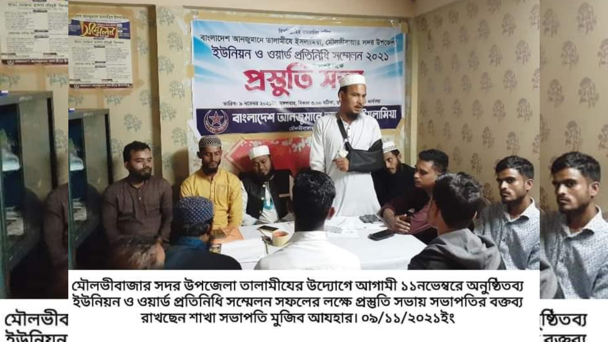মৌলভীবাজার প্রতিনিধি ঃ বাংলাদেশ আনজুমানে তালামীযে ইসলামিয়া মৌলভীবাজার সদর উপজেলা শাখার উদ্যোগে আগামী ১১ই নভেম্বর অনুষ্ঠিতব্য ইউনিয়ন ও ওয়ার্ড প্রতিনিধি সম্মেলন সফলের লক্ষে প্রস্তুতি সভা অনুষ্ঠিত হয়েছে। অদ্য ০৯/১১/২০২১ইং রোজ মঙ্গলবার বিকাল ৩ঘটিকায় সংগঠনের জেলা শাখার কার্যালয়ে শাখা সভাপতি মুজিব আযহারের সভাপতিত্বে ও ভারপ্রাপ্ত সাধারণ সম্পাদক গিয়াস উদ্দিন রাফির পরিচালনায় অনুষ্ঠিত প্রস্তুতি সভায় উপস্থিত ছিলেন সহ সভাপতি কাওছার আহমদ, হাফিজ লুৎফুর রহমান, সহ সাধারণ সম্পাদক ইয়াসিন আরাফাত, বদরুল ইসলাম, সহ সাংগঠনিক সম্পাদক মাসুম হাজারি, আহমেদ জিসান জোসেফ, আব্দুল মোমিত সুহেল, রাসেল আহমদ রুবেল, প্রচার সম্পাদক সজলু আহমদ, সহ প্রচার সম্পাদক খালেদুর রহমান, হাফিজ রুবেল আহমদ, অফিস সম্পাদক নাহিদুল ইসলাম, সহ অফিস সম্পাদক ইফতেখার আহমদ সনী, শেখ ওয়াফিল হাসনাত, প্রশিক্ষণ সম্পাদক রিয়াদ বখস, সহ প্রশিক্ষণ সম্পাদক সায়েম আহমদ, তথ্য ও প্রযুক্তি সম্পাদক রুসেল আহমদ, সহ তথ্য ও প্রযুক্তি সম্পাদক রেদোয়ান আহমদ, সদস্য হুমায়ুন আহমদ রাহি, আকরাম হুসাইন রুমান, হাফিজ রুমান আহমদ, শামসুল ইসলাম, প্রমুখ।