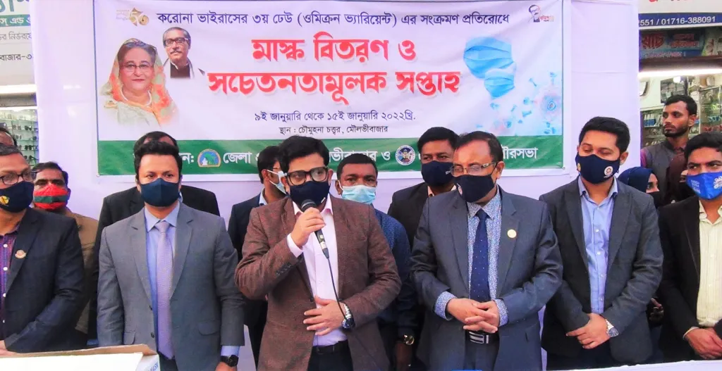 মৌলভীবাজার প্রতিনিধি: করোনাভাইরাসের নতুন ভ্যারিয়েন্ট ওমিক্রন ঠেকাতে মৌলভীবাজার শহরে মাস্ক বিতরণ ও সচেতনতামূলক কার্যক্রম শুরু হয়েছে। রোববার ৯ জানুয়ারি শহরের চৌমোহনাসহ মোট পাঁচটি স্থানে এই কার্যক্রম পরিচালিত হয়। জেলা প্রশাসন ও মৌলভীবাজার পৌরসভার উদ্যোগে এই কার্যক্রমটি পরিচালিত হচ্ছে। আগামী ১৫ জানুয়ারি পর্যন্ত অব্যাহত থাকবে।