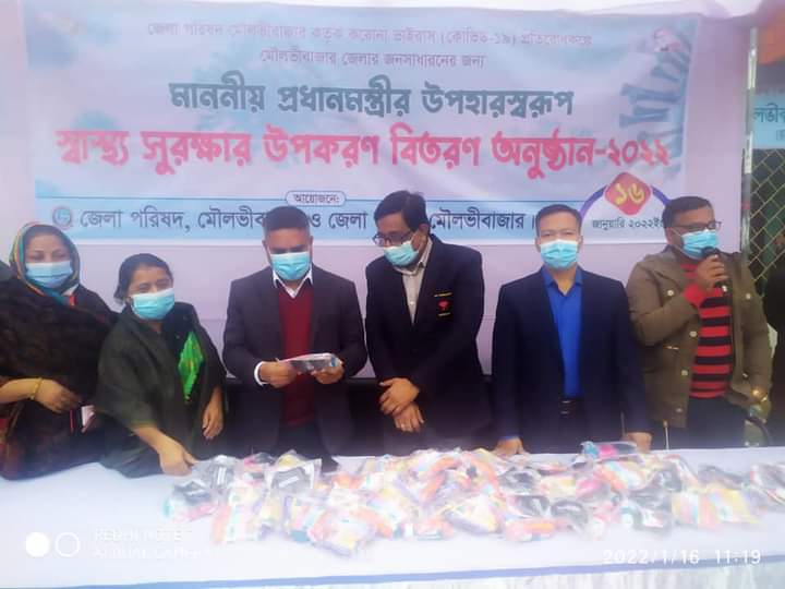 মৌলভীবাজার প্রতিনিধি : রবিবার (১৬ জানুয়ারী) সকাল ১১.২০ ঘটিকায় মৌলভীবাজার প্রেসক্লাব চত্বরে করোনা ভাইরাস (কোভিড- ১৯) এর নতুন ধরন ওমিক্রন মোকাবিলা ও সাধারণ মানুষের মধ্যে সচেতনতা তৈরির লক্ষ্যে মৌলভীবাজার জেলা পরিষদ ও মৌলভীবাজার জেলা পুলিশের আয়োজনে মাননীয় প্রধানমন্ত্রী কর্তৃক উপহারসরূপ স্বাস্থ্য সুরক্ষার বিভিন্ন উপকরণ বিতরণ করা হয়।