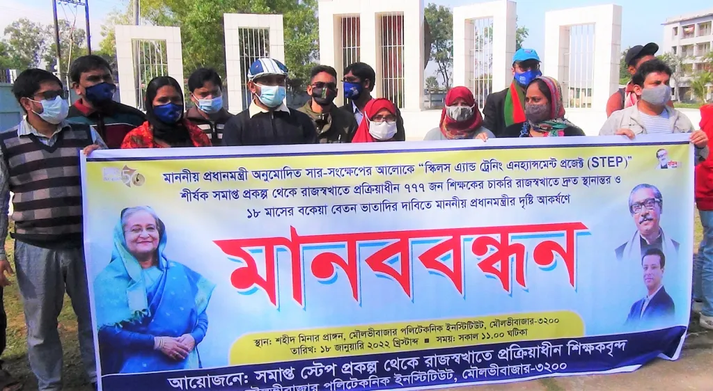 মঙ্গলবার ১৮ জানুয়ারি দুপুরে পলিটেকনিক ক্যাম্পাসের শহীদ মিনার প্রাঙ্গনে সদ্য সমাপ্ত স্টেপ প্রকল্প থেকে রাজস্বখাতে প্রক্রিয়াধিন শিক্ষকদের সংগঠন বাংলাদেশ পলিটেকনিক টিচার্স ফেডারেল (বিপিটিএফ) এর আয়োজনে দাবী আদায়ে ঘন্টাব্যাপী মানববন্ধন অনুষ্ঠিত হয়। মানবন্ধন শেষে বক্তারা বলেন, প্রধানমন্ত্রীর নির্দেশ থাকা সত্যেও ৭৭৭ জন শিক্ষকদের রাজস্বখাতে স্থানান্তর দীর্ঘসুত্রিতার কারণে চরম হতাশার মধ্যে রয়েছেন। দ্রুত দাবী আদায় না হলে তারা কর্মবিরতিসহ বৃহত্তর আন্দোলনের ডাক দেয়া হুমকি দেন।