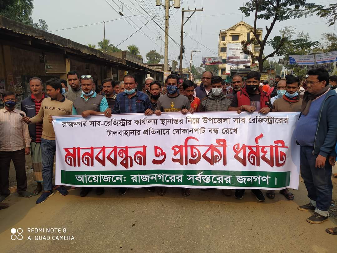 সংশ্লিষ্টরা জানান রাজনগর উপজেলায় ১৯৫৩ সালে সাবরেজিস্ট্রি কার্যক্রম চালু হওয়ার পর থেকে বাজারের আশেপাশে বিভিন্ন স্থাপনা ভাড়া নিয়ে অফিস চলছিল। সর্বশেষ ১৯৯২ সালে উপজেলা পরিষদের ভিতর আইন মন্ত্রণালয়ের ভবনের কয়েকটি কক্ষ নিয়ে অফিসের কার্যক্রম চালানো হচ্ছিল। ৬৯ বছরেও নিজস্ব কোনো অফিস করতে পারেনি রাজনগর সাবরেজিস্ট্রি অফিস। সম্প্রতি নানা অজুহাতে অফিস অন্যত্র স্থানান্তর করার কাজ শুরু হয়। বিষয়টি জানাজানি হলে ব্যবসায়ী ও সাধারণ জনগণের মাঝে তীব্র অসন্তোষ দেখা দেয়। এমনকি এ ঘটনায় গত এক সপ্তাহ ধরে দলিল লেখকরাও অনির্দিষ্টকালের জন্য কলম বিরতি পালন করছেন। দলিল লেখকদের দাবি যেখানে অফিসটি সরিয়ে নেয়ার চেষ্টা হচ্ছে সেখান থেকে ব্যাংক অনেক দূরে। এ কারণে জমির ক্রেতা-বিক্রেতারা লেনদেনের ক্ষেত্রে নিরাপত্তার ঝুঁকিতে পড়বেন। পাশাপাশি দলিল লেখকদেরও জমি রেজিস্ট্রির ফি চালানের মাধ্যমে জমা দিতে হয়। ফলে তারাও ঝুঁকির আশঙ্কা করছেন। এছাড়া উপজেলা পরিষদের আশেপাশের স্থায়ী দোকানগুলোতে দলিল কম্পোজ করা হয়। অফিসটি সরিয়ে নিলে সেখানে দক্ষ কম্পোজার না পাওয়ায় গুরুত্বপূর্ণ এই কাজে ভুলত্রুটি হওয়ার সম্ভাবনা রয়েছে। স্থানীয় ব্যবসায়ীরা জানান, সাবরেজিস্ট্রার নানা অজুহাত দেখিয়ে অফিস সরানোর চেষ্টা করছেন। কর্তৃপক্ষ ভাড়ায় অন্যত্র অফিস নেয়ার চেষ্টা করছে। অথচ উপজেলা পরিষদের পাশে নতুন ভবন থাকা সত্ত্বেও তিনি সেখানে যেতে চাইছেন না বলে অভিযোগ ব্যবসায়ীদের। এঘটনায় ব্যবসায়ী ও সাধারণ মানুষের আয়োজনে মঙ্গলবার একঘন্টা ব্যবসা প্রতিষ্ঠান বন্ধ রেখে মানববন্ধন করা হয়েছে। ইউনিয়ন আওয়ামী লীগের সাধারণ সম্পাদক ফারুকুজ্জামান খানের সভাপতিত্বে মানববন্ধনে বক্তব্য রাখেন উপজেলা আওয়ামী লীগের সাবেক সাংগঠনিক সম্পাদক ফয়ছল আহমদ, ব্যবসায়ী দেওয়ান মিছবাহুল মজিদ কালাম, সাবেক ইউপি চেয়ারম্যান দেওয়ান খয়রুল মজিদ ছালেক, উপজেলা ছাত্রলীগের সাবেক সাধারণ সম্পাদক সাহেদুজ্জামান আনসারী মনাই, সাবেক ছাত্রলীগ নেতা ওবায়েদুর রহমান ডিপলু, নিবারণ ঘোষ ভজন, রাজনগর প্রেসক্লাবের সাধারণ সম্পাদক আব্দুর রহমান সোহেল, আকম মিজানুল হক প্রমুখ। দলিল লেখক সমিতির সভাপতি হিমাংশু শেখর চক্রবর্তী ও সাধারণ সম্পাদক ফরিদ আহমদ জানান, অফিসটি স্থানান্তর করা হলেও যোগাযোগ ও আমাদের গ্রাহকদের আর্থিক নিরাপত্তার কথা বিবেচনায় রাজনগর বাজারের পাশে কোনো ভবনে অফিস নেয়া হোক। অন্যথায় বৃহস্পতিবার থেকে চলমান তাদের কলম বিরতি কর্মসূচি চালিয়ে যাবেন।