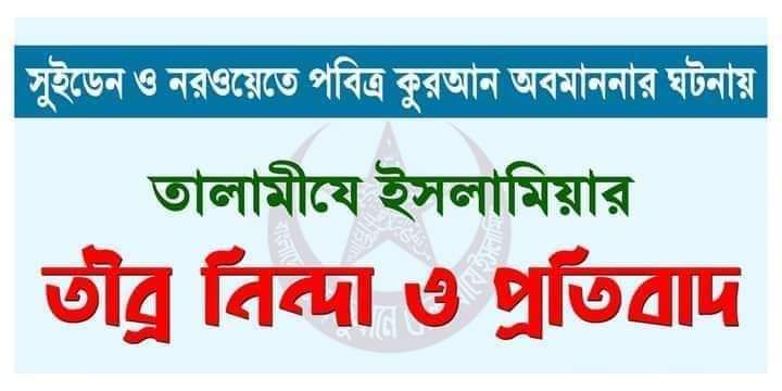 সোমবার সন্ধ্যায় তালামীযে ইসলামিয়ার কেন্দ্রীয় সভাপতি আখতার হোসাইন জাহেদ ও কেন্দ্রীয় সাধারণ সম্পাদক হুময়ূনুর রহমান লেখন এক যৌথ বিবৃতিতে সম্প্রতি সুইডেন ও নরওয়েতে মুসলমানদের ধর্মীয় গ্রন্থ পবিত্র কুরআন অবমাননার ঘটনায় তীব্র নিন্দা ও প্রতিবাদ জানিয়ে বলেন, এ ঘটনাগুলো বিশ্বের মুসলমানদের হৃদয়কে ক্ষতবিক্ষত করেছে।