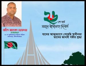 অগ্রযাত্রা সংবাদ ঃ ২৬শে মার্চ মহান স্বাধীনতা দিবসের শুভেচ্ছা জানিয়েছেন মৌলভীবাজার জেলার কমলগঞ্জ উপজেলার ৩নং মুন্সিবাজার ইউনিয়নের চেয়ারম্যান প্রকৌশলী নাহিদ আহমেদ তরফদার। ১৯৭১ সালের ২৫ মার্চ রাতে এ দেশের নিরস্ত্র মানুষের ওপর ঝাঁপিয়ে পড়েছিল পাকিস্তানি হানাদার বাহিনী। বাংলাদেশের প্রতিরোধ যুদ্ধের পথ তৈরি করে দিয়েছিল। এরপর ২৬ মার্চ প্রথম প্রহরে বঙ্গবন্ধু শেখ মুজিবুর রহমানের স্বাধীনতার ঘোষণার পর দীর্ঘ নয় মাসের সশস্ত্র সংগ্রামে আসে মহান বিজয়।