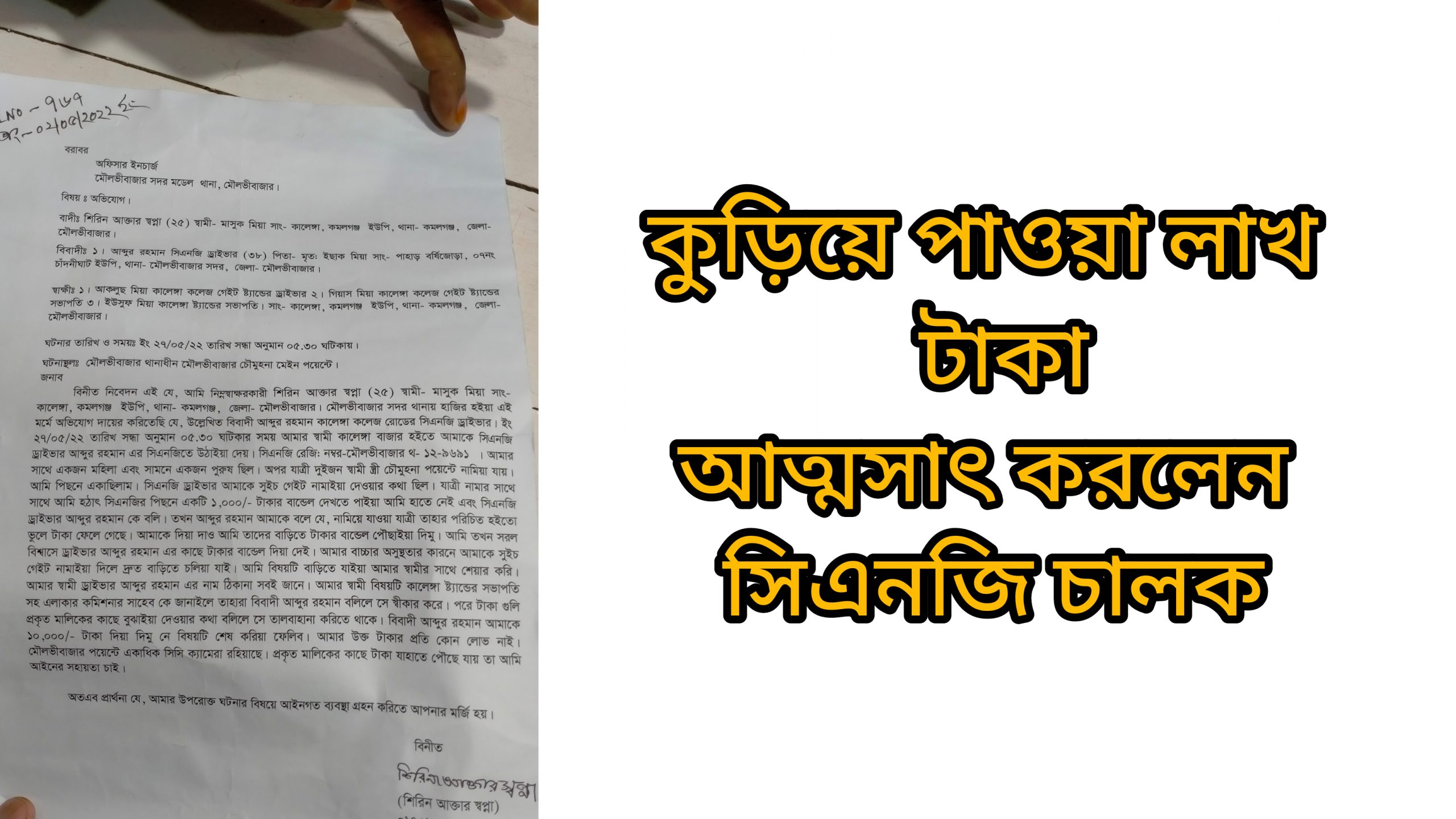 আব্দুল বাছিত খানঃ মৌলভীবাজার সদর উপজেলার চাদনীঘাট ইউনিয়নের পাহাড় বর্ষিজোড়া (দিঘলগজী) গ্রামের মৃত ইছাক মিয়ার পুত্র সিএনজি চালক আব্দুর রহমান (৩০) এর বিরুদ্ধে কুড়িয়ে পাওয়া ১ লাখ টাকা আত্মসাৎ এর অভিযোগ উঠেছে। এনিয়ে প্রত্যক্ষদর্শী কমলগঞ্জ উপজেলার রহিমপুর ইউনিয়নের কালেঙ্গা গ্রামের মাসুক মিয়ার স্ত্রী শিরিনা বেগম স্বপ্না গত ২ মে মৌলভীবাজার মডেল থানায় একটি লিখিত অভিযোগ দেন। এস এল নং-৭৬৭। থানার অভিযোগ সূত্রে জানা যায়,গত ২৭ এপ্রিল বিকাল অনুমান সাড়ে ৫টার দিকে শিরিনা বেগম স্বপ্না মৌলভীবাজার সদরের স্লুইচ গেইট এলাকায় যাবার জন্য সিএনজি চালক আব্দুর রহমান এর সিএনজি মৌলভীবাজার -১২-৯৬৯১ হয়ে মৌলভীবাজার চৌমোহানায় গাড়ি থামিয়ে অপর দুই যাত্রী সম্ভত স্বামী স্ত্রী হবেন তারা নেমে যান। দুই যাত্রী নামার পরে আমি দেখতে পাই ১টা ১০০০ হাজার টাকার বান্ডেল পাই গাড়ীর পিছনের সিটে পরে আছে। সাথে সাথে আমি ড্রাইভার আব্দুর রহমান কে বলি টাকার বাণ্ডেল এর কথা। ড্রাইভার বলে গাড়ীতে দুই জন যাত্রী তার পরিচিত হয় তাদেরকে টাকা ফেরত দেবে বলে টাকার বান্ডেল আমার কাছ থেকে নিয়ে যায়। এ ঘটনা আমি বাসায় গিয়ে আমার স্বামীকে বলিলে আমার স্বামী সিএনজি চালক আব্দুর রহমান এর সাথে যোগাযোগ করলে সে টাকা পাওয়ার কথা স্বীকার করে এবং এব্যাপারটা কারো সাথে না বলার জন্য অনুরোধ করে এবং আমার স্বামীকে ১০০০০/দশ হাজার টাকা দিবার জন্য অফার করে। আমার স্বামী তা গ্রহণ করেন নাই বরং তিনি ড্রাইভারকে বলেছেন প্রকৃত মালিক খোজে টাকা ফেরত দেওয়ার জন্য।