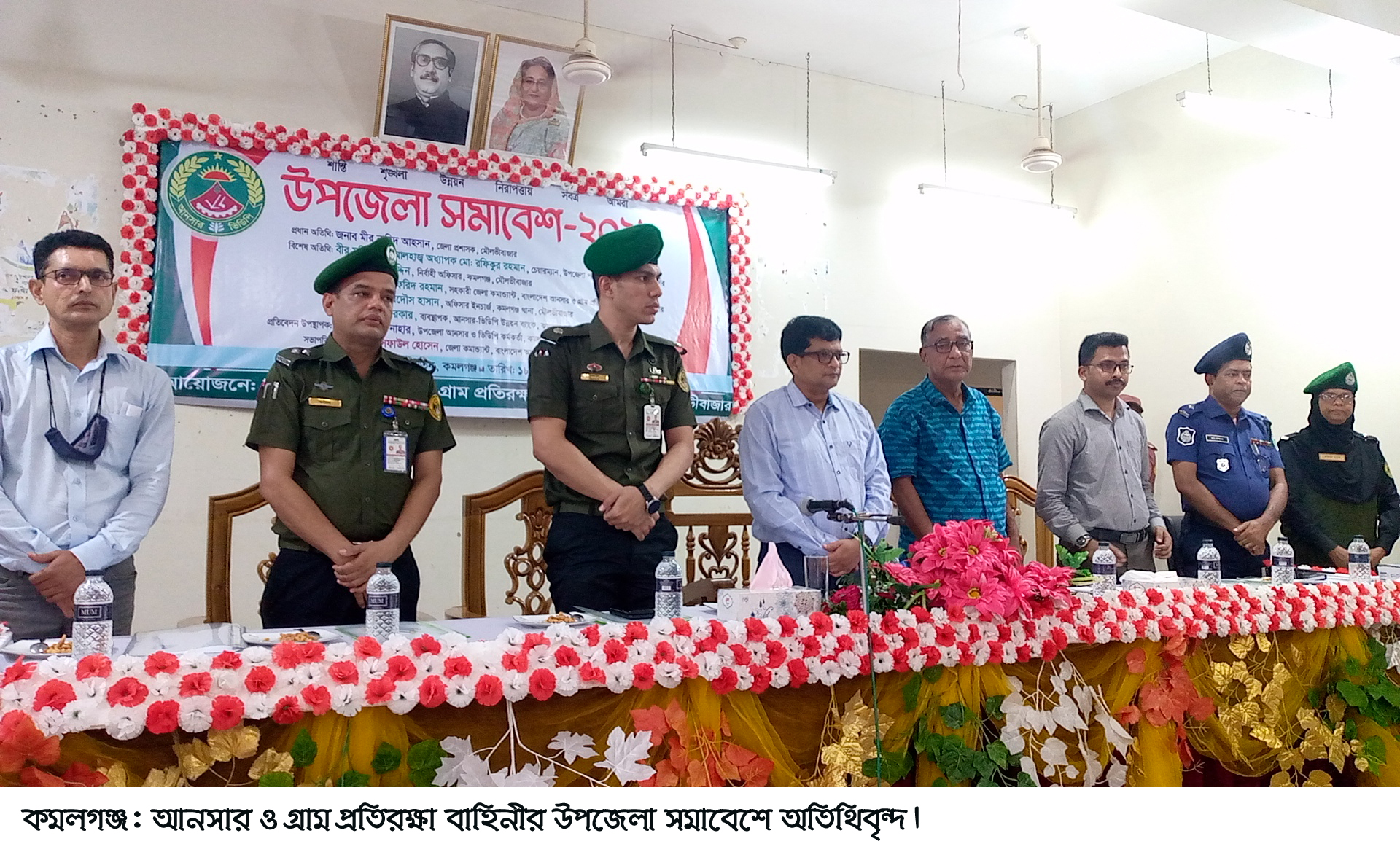 “শান্তি শৃঙ্খলা উন্নয়ন নিরাপত্তায় সর্বত্র আমরা” এই শ্লোগানে বাংলাদেশ আনসার ভিডিপি ও গ্রাম প্রতিরক্ষা বাহিনীর উপজেলাসমাবেশ অনুষ্ঠিত হয়েছে। বুধবার বিকালে মৌলভীবাজারের কমলগঞ্জ উপজেলা পরিষদ মিলনায়তনে মৌলভীবাজার জেলা কমান্ড্যান্ট মোঃ সেফাউল হোসেনের সভাপতিত্বে সমাবেশে প্রধান অতিথি হিসেবে উপস্থিত ছিলেন মৌলভীবাজার জেলা প্রশাসক মীর নাহিদ আহসান। বিশেষ অতিথি হিসেবে উপস্থিত ছিলেন উপজেলা পরিষদের চেয়ারম্যান বীর মুক্তিযোদ্ধা অধ্যাপক মোঃ রফিকুর রহমান, উপজেলা নির্বাহী অফিসার সিফাত উদ্দিন, আনসার ভিডিপি ও গ্রাম প্রতিরক্ষা বাহিনীর সহকারী জেলা কমান্ড্যান্ট মোহাম্মদ ফরিদ রহমান, কমলগঞ্জ থানার অফিসার ইনচার্জ (তদন্ত) মোঃ আব্দুর রাজাক, কমলগঞ্জ আনসার ভিডিপি উন্নয়ন ব্যাংকের ব্যবস্থাপক উৎপল সরকার।
