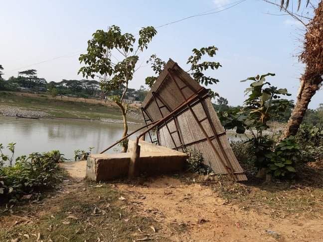 সরেজমিনে দেখা যায়, এ যাত্রী ছাউনিটির দুই ভিত্তি স্তম্ভ নদী ভাঙনের কারণে এরইমধ্যে নদীগর্ভে চলে গেছে। মূল কাঠামো কোনো রকম নদীর তীর ঘেঁষে দাঁড়িয়ে আছে। যা যেকোনো মুহূর্তে নদী গর্ভে বিলীন হয়ে যেতে পারে।