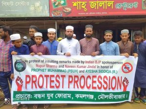মহানবী হজরত মুহাম্মদ (সাঃ) কে নিয়ে কটুক্তির প্রতিবাদে মৌলভীবাজারের কমলগঞ্জ উপজেলায় সর্বস্তরের জনসাধারণের ব্যানারে  মানবন্ধন ও বিক্ষোভ সমাবেশ অনুষ্ঠিত হয়। ৯ জুন সকাল ১১টায় উপজেলার মুন্সিবাজার যাত্রী ছাউনীর সামনে