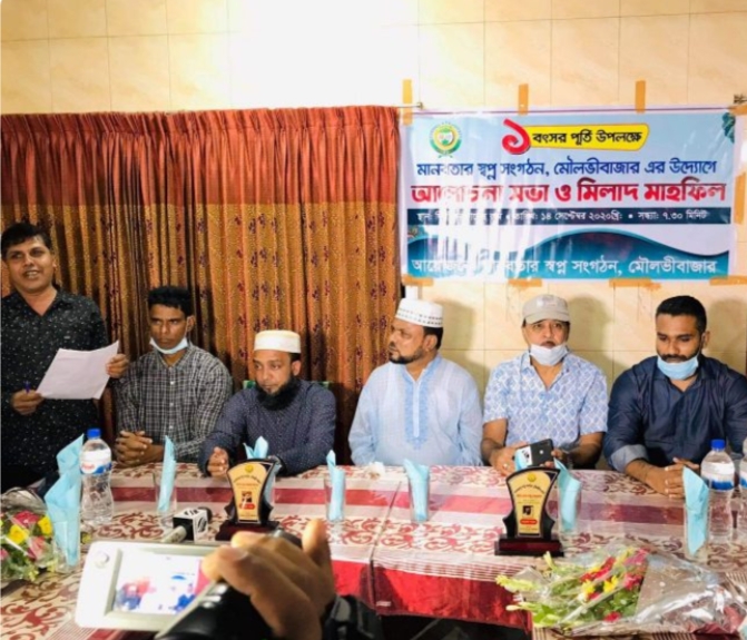 মৌলভীবাজার প্রতিনিধি:: মানবতা স্বপ্ন সংগঠনের ১ম প্রতিষ্টাবাষিকী উপলক্ষে সংগঠনের পক্ষ থেকে এক আলোচনা সভা ও মিলাদ মাহফিলের আয়োজন করা হয় সোমবার সন্ধা ৭ঘটিকায় । সামাজিক ও মানবাধিকার ব্যক্তিত্ব , সংগঠনের এডমিন জনাব শামীম আহমদ এর সভাপতিত্বে সামাজিক ব্যক্তিত্ব মো: নানু মিয়ার উপস্থাপনায় পবিত্র কোরআন তেলাওয়াত করেন মৌলানা কারী আব্দুল রাকিব ,প্রধান অতিথি হিসাবে উপস্থিত ছিলেন সংগঠনের এডমিন সামাজিক ব্যক্তিত্ব জালালাবাগ এসোসিয়েশন এর সাবেক সহ সভাপতি জনাব শেখ সামছু তালুকদার , বিশেষ অতিথি বিশিষ্ট নাট্যকার, সামাজিক ব্যক্তিত্ব, সম্মিলিত সামাজিক উন্নয়ন পরিষদের সভাপতি , চ্যানেল এস এর হেড অব নিউজ জনাব খালেদ চৌধুরী , বিশেষ অতিথি সামাজিক ও মানবাধিকার ব্যক্তিত্ব , সম্মিলিত সামাজিক উন্নয়ন পরিষদের সাধারন সম্পাদক জনাব আলিম উদ্দীন হালিম , বিশেষ অতিথি তওহীদুল ইসলাম সভাপতি দাবা এসোসিয়েশন মৌলভীবাজার জেলা,আরও বক্তব্য রাখেন – আব্দুল আলিম , তাজুল চৌ, তারেক আহমদ,- মিডিয়ায় ছিলেন জুবায়ের আহমদ,সংগঠনের সদস্যগণের মাঝে উপস্থিত ছিলেন- রিমন আহমদ,সাদ্দাম হোসেন,শহীদ মিয়া , লিটন আহমদ, হেলাল মিয়া,জে কে জসীম, মো কুতুব মিয়া, জাবেদ আহমদ, হোসাইন আহমদ সহ আরও অনেকে -এছাড়া ও প্রতিষ্টাবাষিকী অনুষ্ঠানে যারা আর্থিকভাবে সহযোগিতা করেছেন