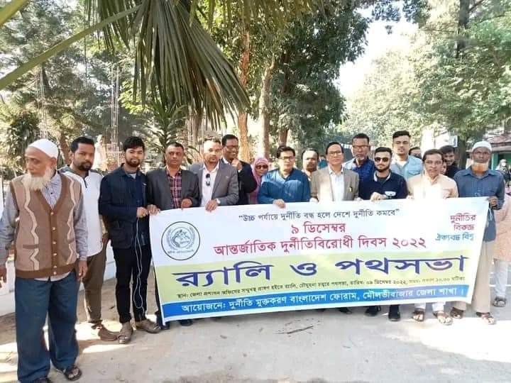আজ ৯ ডিসেম্বর-২০২২ইং, রোজ শুক্রবার আন্তর্জাতিক দুর্ণীতি বিরোধী দিবস-২০২২ উপলক্ষে প্রতি বছরের ন্যায় এবারও বিভিন্ন কর্মসূচী গ্রহণ করেছে দুর্নীতি মুক্তকরণ বাংলাদেশ ফোরাম, মৌলভীবাজার জেলা শাখা। “দুর্ণীতির বিরুদ্ধে ঐক্যবদ্ধ বিশ্ব”এই প্রতিপাদ্য বিষয়কে ধারণ করে এবং এরই ধারাবাহিকতায় ঐদিন সকাল ১০ ঘটিকায় জেলা প্রশাসন, মৌলভীবাজার অফিসের সম্মুখস্থ প্রাঙ্গন থেকে দিনের কর্মসূচী সূচনা উপলক্ষে র্যালী এবং র্যালী শেষে চৌমোহনী চত্বরে পথ সভা অনুষ্ঠিত হয়। উক্ত র্যালীতে উদ্বোধক হিসাবে উপস্থিত ছিলেন - মাননীয় মৌলভীবাজার জেলা প্রশাসক মীর নাহিদ আহসান। পথ সভাসহ অন্যান্য কর্মসূচীতে অংশগ্রহন করে আমাদের উৎসাহিত করে দুর্ণীতি মুক্ত কার্যক্রমে দুর্নীতি মুক্তকরণ বাংলাদেশ ফোরাম, মৌলভীবাজার জেলা শাখা‘র সভাপতি আলহাজ্ব এড.মাহবুবুল আলম শামীম ও সাধারণ সম্পাদক সাংবাদিক মশাহিদ আহমদসহ সহ আন্তর্জাতিক মানবাধিকার দুর্নীতি বিরোধী সোসাইটির সিলেট বিভাগীয় পরিচালক মোঃ জোসেপ আলী চৌধুরী ও অন্যান্য নেতৃবৃন্দ উপস্থিত ছিলেন ।