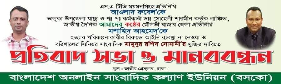মৌলভীবাজার অনলাইন প্রেসক্লাবের সাধারণ সম্পাদক ও দৈনিক আমাদের কণ্ঠ পত্রিকার মৌলভীবাজার জেলা প্রতিনিধি সাংবাদিক মশাহিদ আহমদ কে হত্যার পরিকল্পনাকারীর বিরুদ্ধে মৌলভীবাজার মডেল থানায় আইনি ব্যবস্থা না নেওয়ায় ও বরিশালের সিনিয়র সাংবাদিক মামুনুর রশীদ নোমানীর মুক্তির দাবিতে ২৩ সেপ্টেম্বর রোজ বুধবার ঢাকা জাতীয় প্রেসক্লাবের সামনে মানববন্ধন অনুষ্ঠিত হয়েছে। সকাল সাড়ে ১১ টায় ওই মানববন্ধন ও প্রতিবাদ সভা অনুষ্ঠিত হয়। উক্ত মানববন্ধনে বক্তব্য রাখেন বাংলাদেশ অনলাইন সংবাদপত্র সম্পাদক পরিষদ (বনেক) এর সভাপতি ও দৈনিক আমাদের কন্ঠের বিশেষ প্রতিনিধি খায়রুল আলম রফিক, ঢাকা সাংবাদিক ইউনিয়নের সদস্য আমিনুল ইসলাম, সাংবাদিক তরিকুল ইসলাম, সাংবাদিক ইমন খান, সাংবাদিক শাকিল আহমেদ, সাংবাদিক জীবন চক্রবর্তী প্রমুখ। এছাড়াও ওই মানববন্ধনে এসএ টিভির ময়মনসিংহ জেলা প্রতিনিধি আওলাদ রুবেলকে লাঞ্ছিত করা ও মৌলভীবাজারে দৈনিক আমাদের কন্ঠ পত্রিকার জেলা প্রতিনিধি মশাহিদ আহমদকে হত্যার পরিকল্পনাকারীর বিরুদ্ধে আইনগত ব্যবস্থা না নেওয়ায় জোর প্রতিবাদ জানানো হয়।