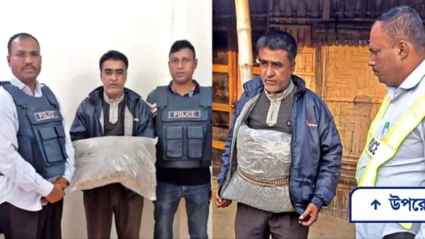 নিজস্ব প্রতিবেদকঃ মৌলভীবাজারের কমলগঞ্জে তীব্র গরমের মধ্যে গায়ে জ্যাকেট পরে ভেতরে এক ব্যাগ গাঁজা নিয়ে যাচ্ছিলেন যুবক। এ সময় গোপনে খবর পেয়ে তাকে আটক করে পুলিশ। ১৪ এপ্রিল শুক্রবার দুপুরে উপজেলার ইসলামপুর ইউনিয়নের দক্ষিণ গোলের হাওর এলাকায় এক কেজির বেশি গাঁজাসহ বকুল মিয়া (৪৫) নামে এক যুবককে আটক করেছে পুলিশ। তিনি একই এলাকার মৃত তনু মিয়ার ছেলে। পুলিশ জানায়, গোপন সংবাদের ভিত্তিতে কমলগঞ্জ থানার উপপরিদর্শক (এসআই) মহাদেব বাছার ও সহকারী উপপরিদর্শক (এএসআই) পরিমল চন্দ্র মিলে বিশেষ অভিযান পরিচালনা করে ১ কেজি ২০০ গ্রাম গাঁজা ও একটি মোটরসাইকেলসহ বকুল মিয়াকে আটক করেন।
