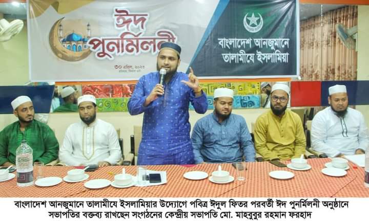 অগ্রযাত্রা সংবাদ:বাংলাদেশ আনজুমানে তালামীযে ইসলামিয়ার পবিত্র ঈদুল ফিতর পরবর্তী পুনর্মিলনী অনুষ্ঠিত হয়েছে। অদ্য ৩০ এপ্রিল, রবিবার, বিকাল ৩ ঘটিকার সময় একটি অভিজাত রেস্টুরেন্টে এ পুনর্মিলনী অনুষ্ঠিত হয়। এতে সভাপতির বক্তব্য রাখেন সংগঠনের কেন্দ্রীয় সভাপতি মো. মাহবুবুর রহমান ফরহাদ।তালামীযে ইসলামিয়ার কেন্দ্রীয় সাধারণ সম্পাদক মনজুরুল করিম মহসিন এর পরিচালনায় অনুষ্ঠানে শুভেচ্ছা বক্তব্য রাখেন সংগঠনের কেন্দ্রীয় সাংগঠনিক সম্পাদক মো. জাহেদুর রহমান, প্রচার ও প্রকাশনা সম্পাদক এস এম মনোয়ার হোসেন, সহ-প্রচার ও প্রকাশনা সম্পাদক আব্দুস সামাদ আজাদ।