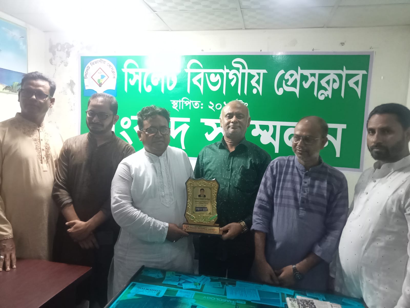 শুক্রবার (১২ মে) নগরীর গার্ডেন টাওয়ারস্থ সিলেট বিভাগীয় প্রেসক্লাব পরিদর্শনে আসলে তাঁর হাতে সম্মাননা স্মারক ক্রেস্ট তুলে দিয়ে শুভেচ্ছা বিনিময় করেন সিলেট বিভাগীয় প্রেসক্লাবের সভাপতি খায়রুল আলম সুমন, সহ-সভাপতি মোঃজোসেপ আলী চৌধুরী, সাধারণ সম্পাদক সুহেল আহমদ, সিনিয়র যুগ্ন সাধারণ সম্পাদক মুহিবুর রহমান মিছলু, অর্থ সম্পাদক মোঃ সবুজ মিয়া, দপ্তর সম্পাদক আবুল কালাম।