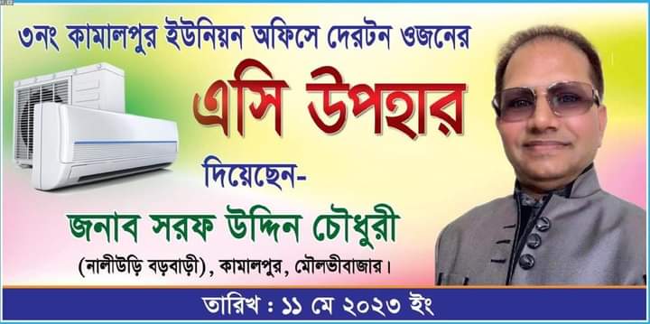 মৌলভীবাজার সদর উপজেলার কামালপুর ইউনিয়ন পরিষদকে এসি উপহার প্রদান করেছেন যুক্তরাজ্য প্রবাসী বিশিষ্ট ব্যবসায়ী সমাজ সেবক মানবাধিকার কর্মী মোঃ সরফ উদ্দিন চৌধুরী(নালীহুরী বড়বাড়ী । ১১ মে রোজ বৃহস্পতিবার দুপুরে কামালপুর ইউনিয়ন পরিষদকে আনুষ্ঠানিকভাবে এসি উপহার প্রদান করেছেন লন্ডন প্রবাসী মো সরফ উদ্দিন চৌধুরীর পক্ষে তার পরিবারের সদস্যগন ও এলাকাবাসী । এসময় সদর উপজেলার ৩নং কামালপুর ইউনিয়নের চেয়ারম্যান মো: আপ্পান আলী ইউপি সদস্যগন এবং কামালপুর ইউনিয়নবাসী উপস্থিত থেকে এসি উপহার গ্রহণ করেন। এ উপলক্ষে ইউনিয়ন পরিষদের হলরুমে মিলাদ মাহফিল ও দোয়া অনুষ্ঠিত হয়। উক্ত অনুষ্ঠানে উপস্থিত ছিলেন কামাল পুর বাজার ব্যবসায়ী সমিতির সভাপতি মোঃ জোসেপ আলী চৌধুরী সিনিয়র সভাপতি অনুকূল চন্দ্র দেব সাধারণ সম্পাদক মোঃ নজরুল ইসলাম সাংগঠনিক সম্পাদক মোঃ কাওসার আহমেদ ও নির্বাহী সদস্য মোঃ তৈয়ুবুর রহমান মোঃ মোস্তাকিম মিয়া সহ বাজারের অনেক ব্যবসায়ী সহ এলাকার লন্ডন প্রবাসী হাজি আঃ রহমান তালেব বিশিষ্ট ব্যবসায়ী হাজি আলাউর রহমান মোঃ মগনুজ্জামান মোঃ মসাহিদ মিয়া মোঃ সিরাজুল ইসলাম মোঃ মিন্টু মিয়া সাংবাদিক মুহিব সহ এলাকার অনেক সম্মানিত লোকজন উপস্থিত ছিলেন।
