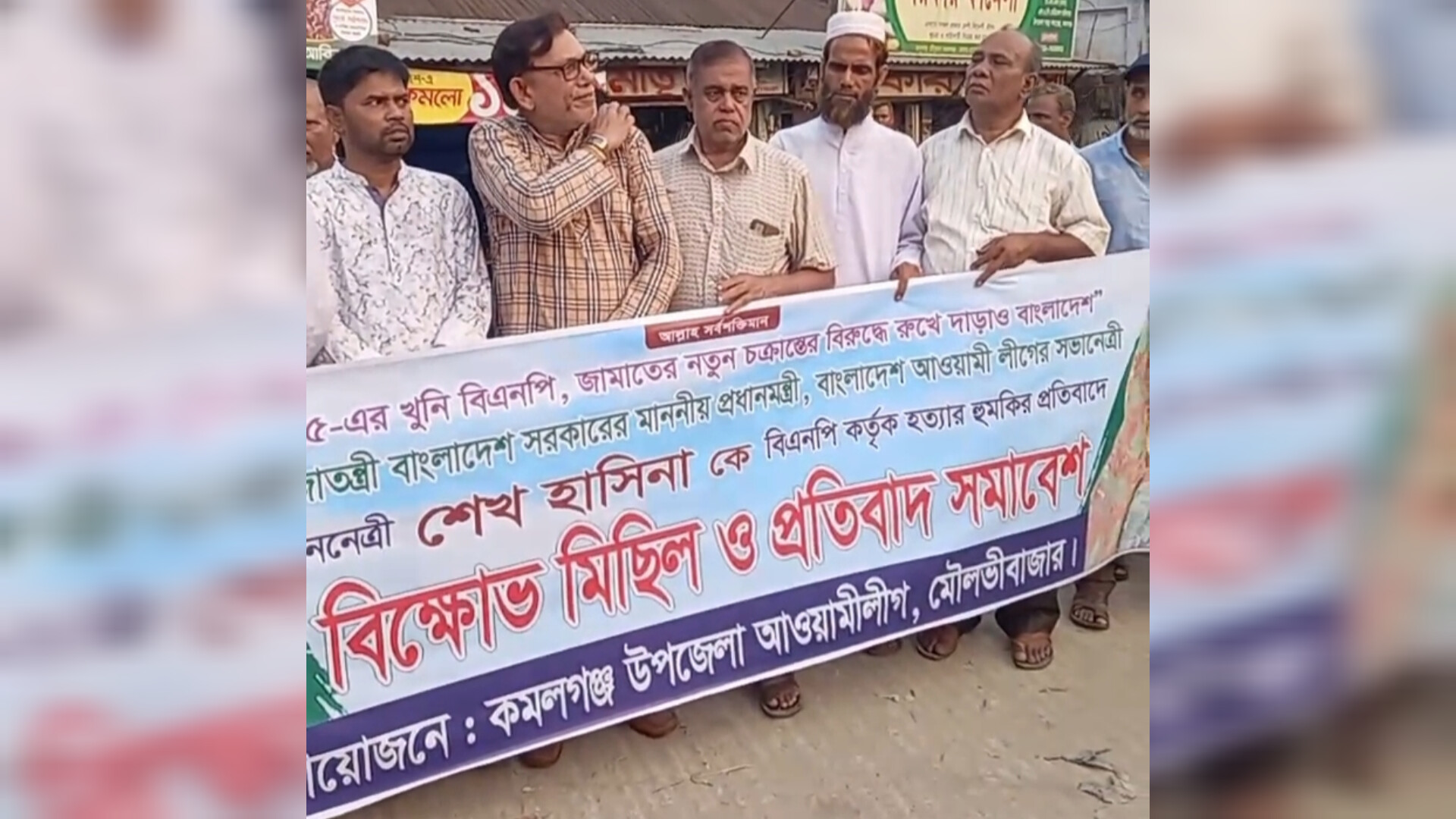 রাজশাহী জেলা বিএনপির সভাপতি কর্তৃক প্রধানমন্ত্রী ও বাংলাদেশ আওয়ামী লীগের সভাপতি শেখ হাসিনাকে হত্যার হুমকির প্রতিবাদে বিক্ষোভ মিছিল করেছে মৌলভীবাজারের কমলগঞ্জ উপজেলা আওয়ামী লীগ ও যুবলীগ। সোমবার বিকাল ৫টায় পৌরসভা থেকে এক বিক্ষোভ মিছিল বের হয়। মিছিল শেষে ভানুগাছ চৌমুহনা চত্বরে এক প্রতিবাদ সমাবেশ অনুষ্ঠিত হয়।