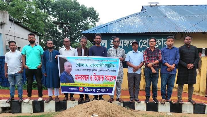 শ্রীমঙ্গল প্রতিনিধি: জামালপুরে বাংলানিউজ টোয়েন্টিফোর ডটকমের জেলা প্রতিনিধি সাংবাদিক গোলাম রব্বানি নাদিমের হত্যাকারীদের দৃষ্টান্তমূলক শাস্তির দাবিতে মৌলভীবাজারের শ্রীমঙ্গলে মানববন্ধন ও বিক্ষোভ সমাবেশ করেছেন সাংবাদিকরা। শ্রীমঙ্গল প্রেসক্লাবের আয়োজনে রবিবার (১৮জুন) বেলা ১২টায় কলেজ রোডস্থ শ্রীমঙ্গল প্রেসক্লাবের সামনে এক মানববন্ধন ও বিক্ষোভ সমাবেশ অনুষ্ঠিত হয়।