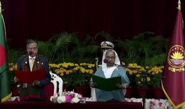 টানা চতুর্থবারের মতো প্রধানমন্ত্রী হিসেবে শপথ নিয়েছেন আওয়ামী লীগ সভাপতি শেখ হাসিনা। একই সঙ্গে শপথ নিয়েছেন নতুন মন্ত্রিসভার সদস্যরা। বৃহস্পতিবার সন্ধ্যায় বঙ্গভবনে প্রধানমন্ত্রীসহ নতুন মন্ত্রিসভার ৩৭ জন সদস্যকে শপথবাক্য পাঠ করান রাষ্ট্রপতি মো. সাহাবুদ্দিন। এর মাধ্যমে সব মিলিয়ে পঞ্চমবারের মতো প্রধানমন্ত্রী হিসেবে শপথ নিলেন শেখ হাসিনা।