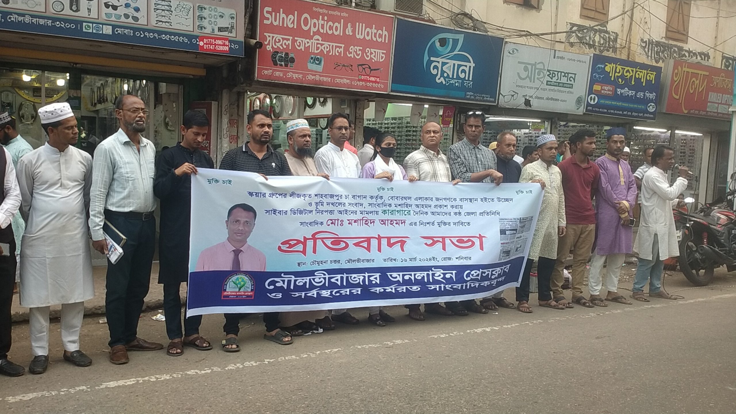মৌলভীবাজার অনলাইন প্রেসক্লাবের সাধারণ সম্পাদক ও দৈনিক আমাদের কন্ঠ পত্রিকার মৌলভীবাজার প্রতিনিধি মশাহিদ আহমদ এর বিরুদ্বে সাইবার ডিজিটাল নিরাপত্তা আইনে মামলায় কারাগারে থাকায় মশাহিদ আহমদ এর নি: শ্বর্ত মুক্তির দাবিতে প্রতিবাদ সভা ও মানববন্ধন অনুষ্টিত হয়েছে। ১৬ মার্চ শনিবার বেলা ২টায় মৌলভীবাজার চৌমোহনা চত্বরে ঘণ্টাব্যাপী মানববন্ধন কর্মসূচি পালন করেন মৌলভীবাজারে কর্মরত সাংবাদিকরা।
