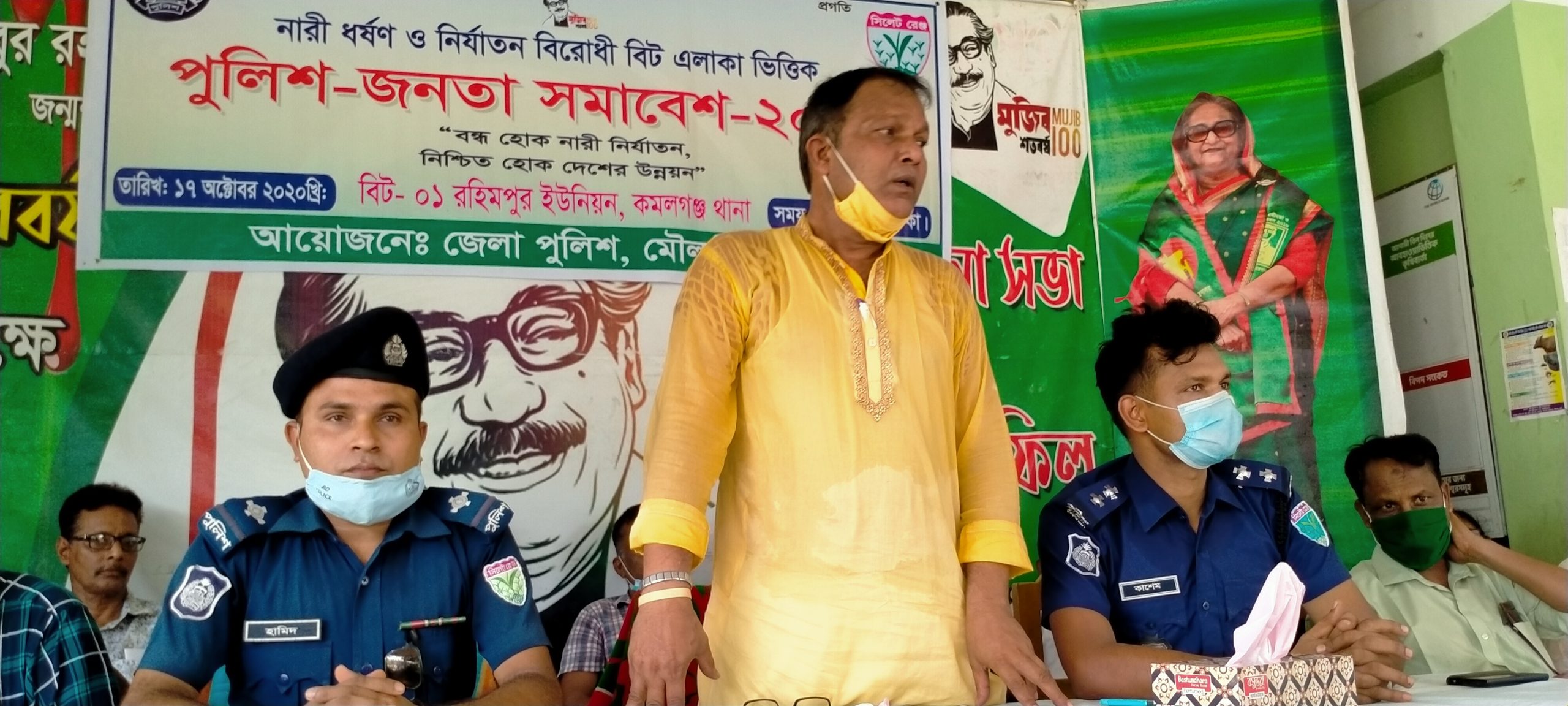 নিজস্ব প্রতিনিধি :: “বন্ধ হোক নারী নির্যাতন, নিশ্চিত হোক দেশের উন্নয়ন” এবং “নারীর প্রতি সহিংসতা প্রতিরোধে আপনার পুলিশ আপনার পাশে” এই স্লোগানকে সামনে রেখে মৌলভীবাজার জেলা পুলিশের আয়োজনে আজ শনিবার (১৭ অক্টোবর) সকাল ১০ টায় কমলগঞ্জ থানাধীন ১নং বিট রহিমপুর ইউনিয়নে সামাজিক দূরত্ব বজায় রেখে, স্বাস্থ্যবিধি মেনে নারী ধর্ষণ ও নির্যাতন বিট এলাকা ভিত্তিক পুলিশ -জনতা সমাবেশ ও র্যালি অনুষ্ঠিত হয়।১নং রহিমপুর ইউনিয়ন ছাত্রলীগের সহ-সভাপতি শামিম ওসমানের সঞ্চালনায় কমলগঞ্জ থানার ১নং রহিমপুর ইউনিয়ন বিট পুলিশের দায়িত্বপ্রাপ্ত কর্মকর্তা এস আই আবুল কাশেম এর সভপতিত্বে প্রধান অতিথি হিসেবে বক্তব্য প্রদান করেন