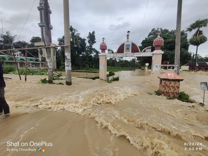 মৌলভীবাজারের রাজনগরে মনু নদ প্রকল্প বাঁধের একাধিক স্থান ভেঙে গেছে।